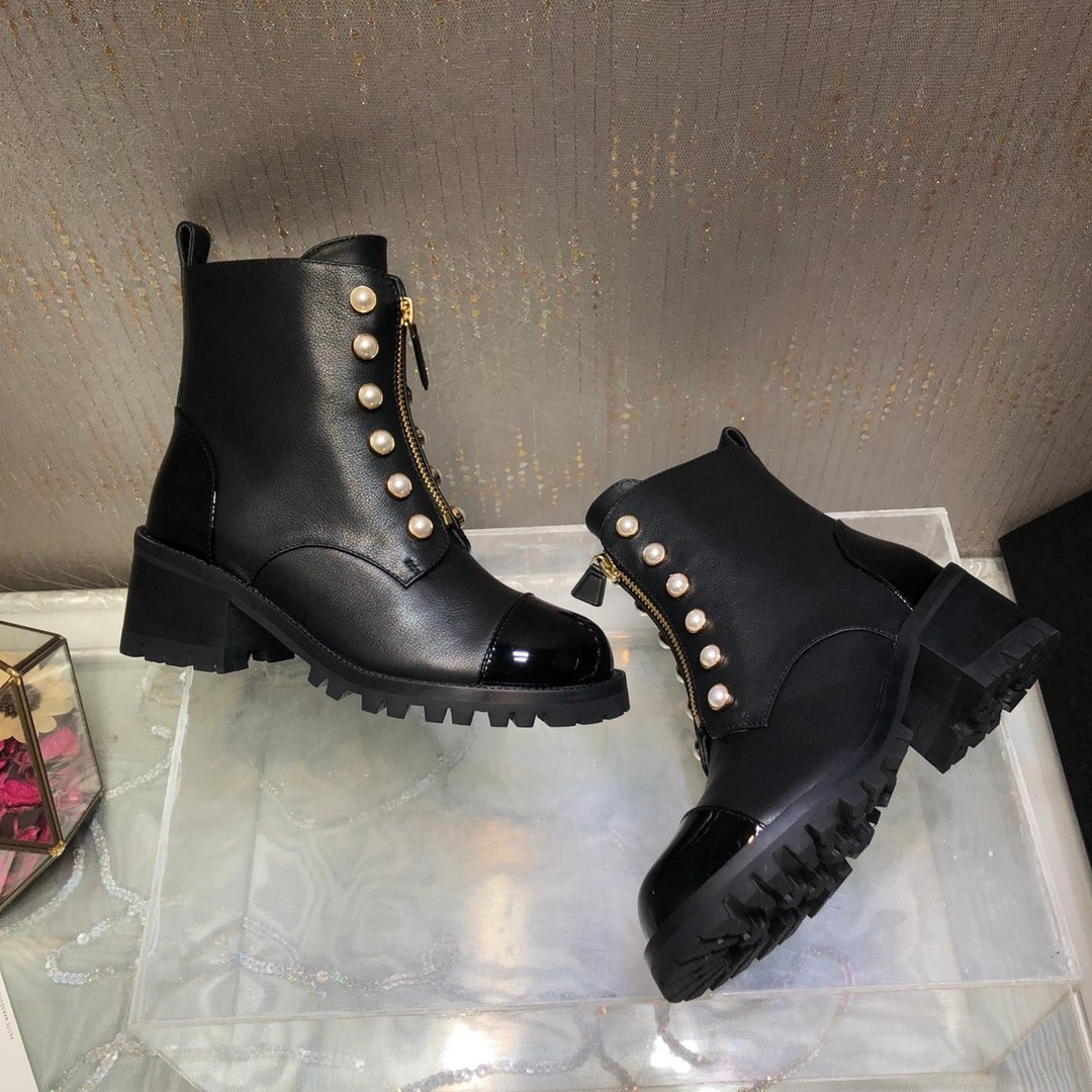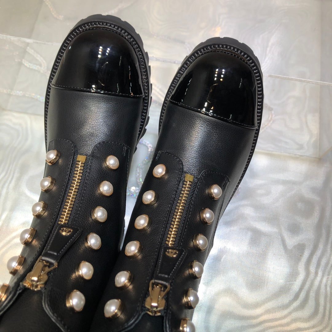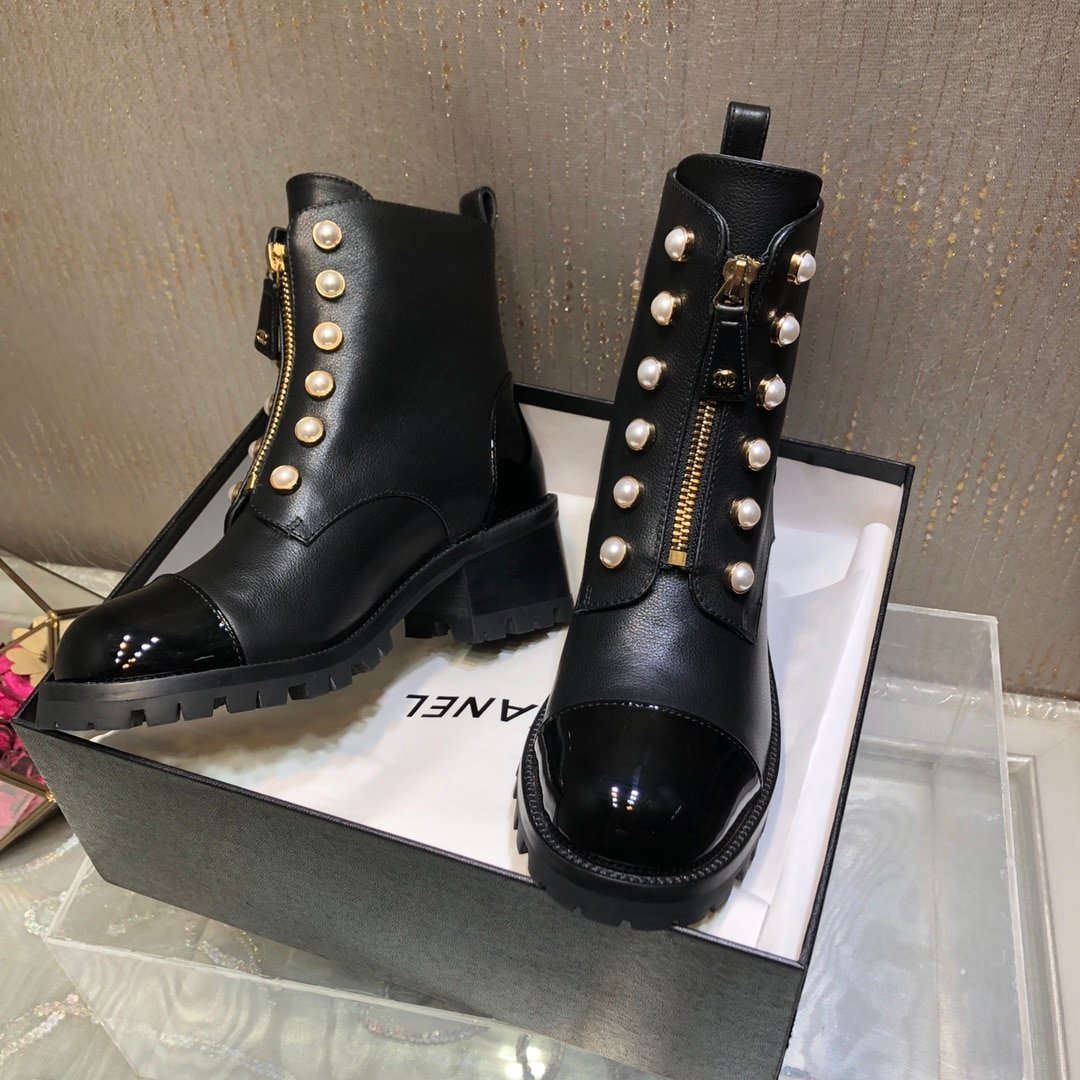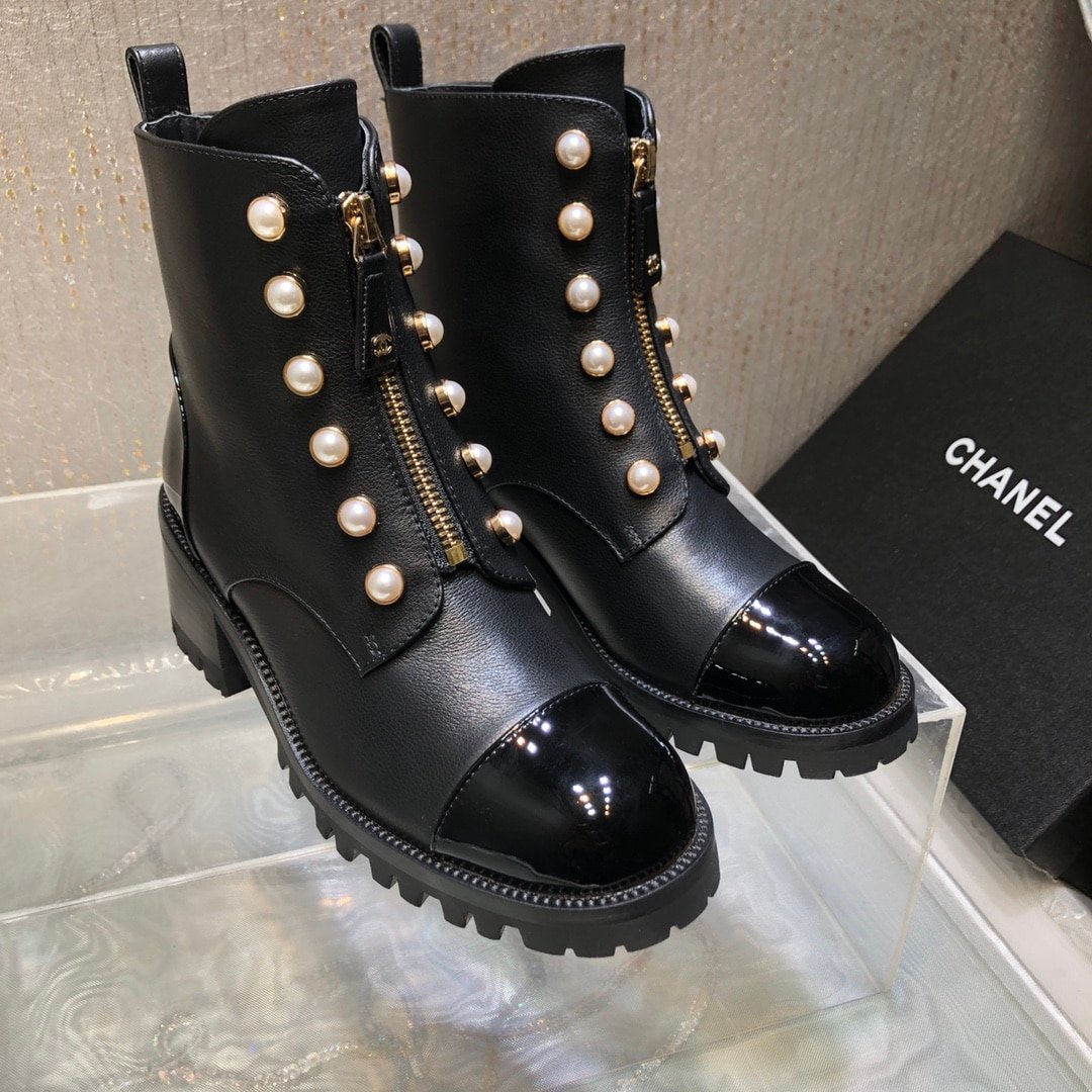 Chanel Cc Pearl Front Zipper Short Boots Black