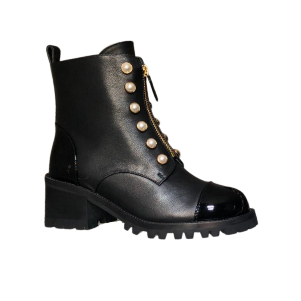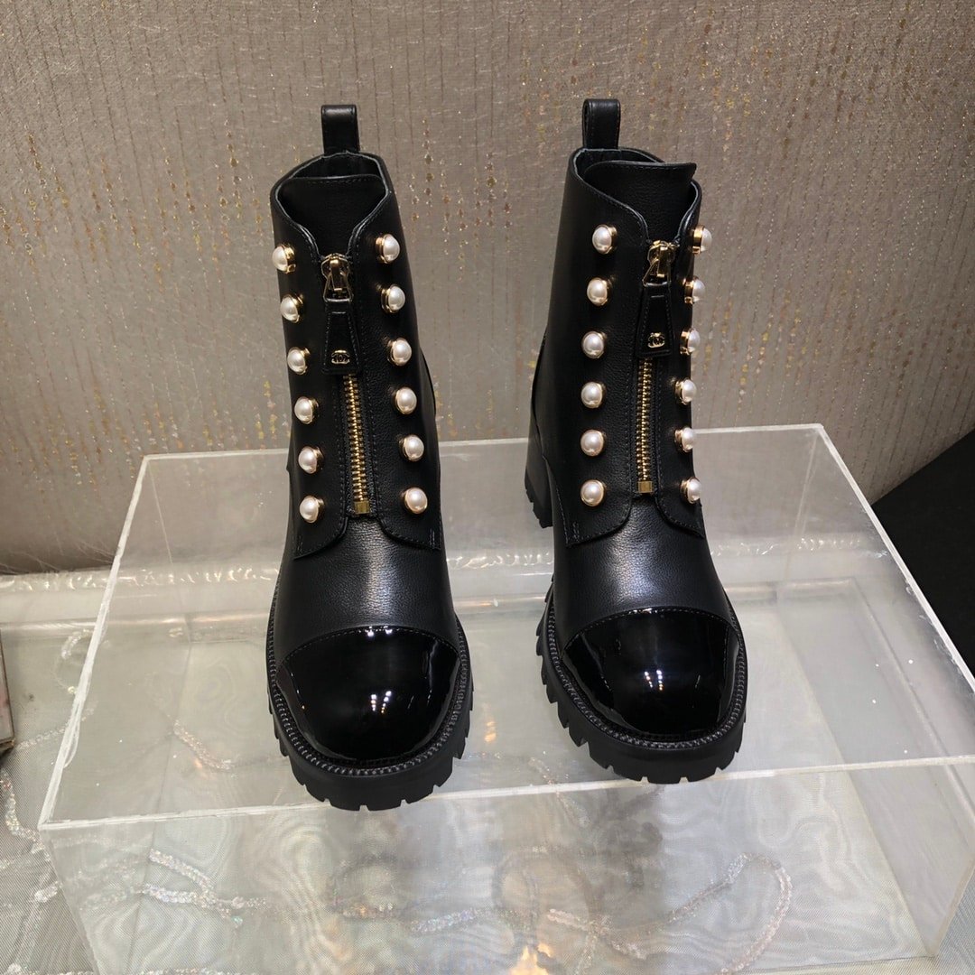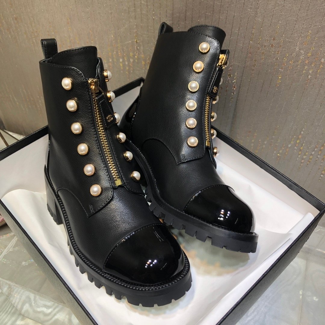 Chanel Cc Pearl Front Zipper Short Boots Black