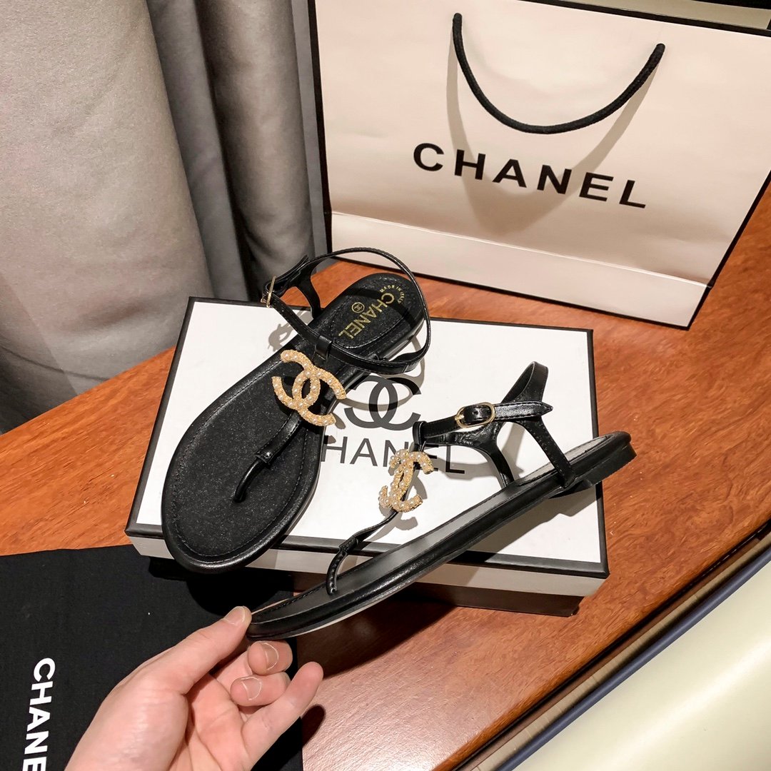 Chanel Gold Pearl Cc Logo Thong Sandals Black
