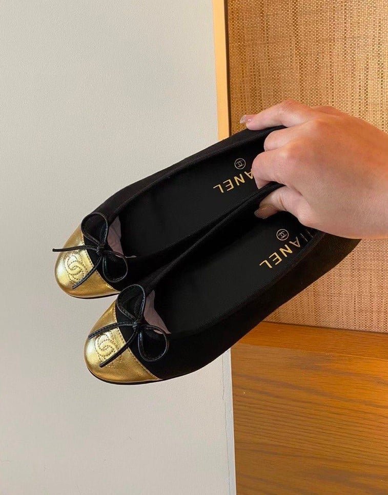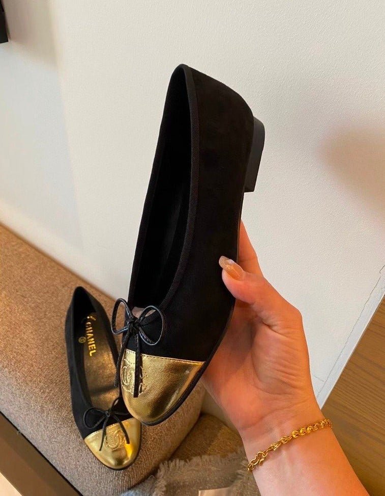 Be the first to review “Chanel Leather Cap Toe Ballet Flats Black Gold”