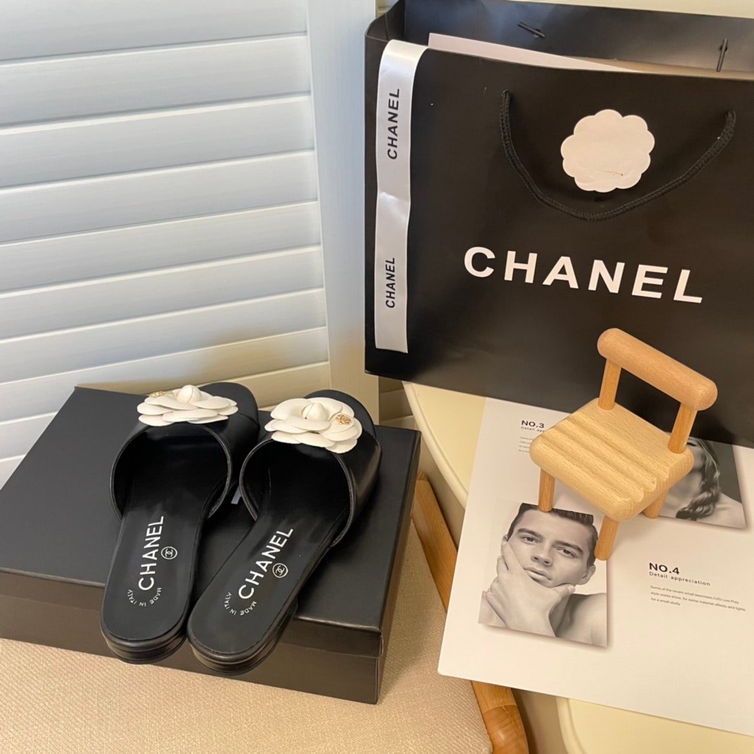 Chanel White Camellia Slides Black