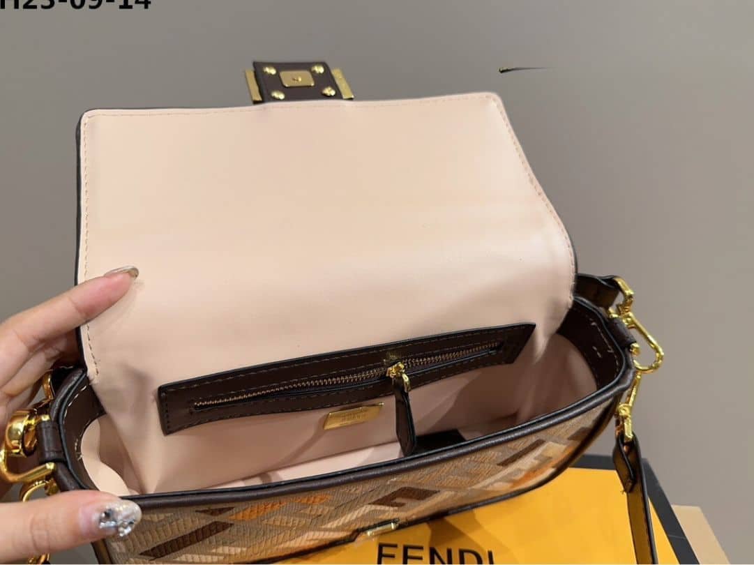 • Finished with a dark brown leather trim and embellished with an FF clasp.