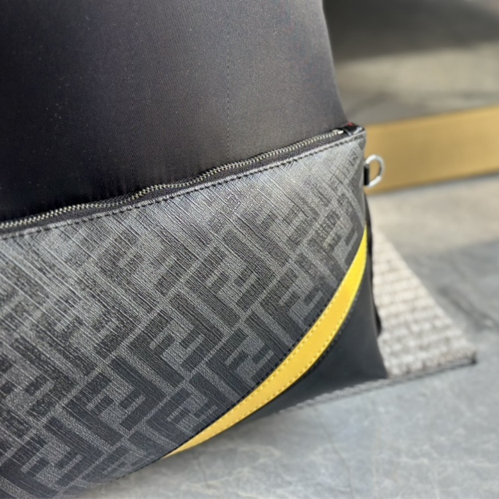 1:1 REPLICA BAGS Measurements: 35 x 33 cm / 13.8 x 13 inches Large backpack with front pocket. Breathable technical mesh back and adjustable shoulder straps. Zip fastening with double slider and inside pocket. Made of black nylon. Embellished with gray textured weave fabric with FF motif. Pocket with black leather insert and inlaid detail […]