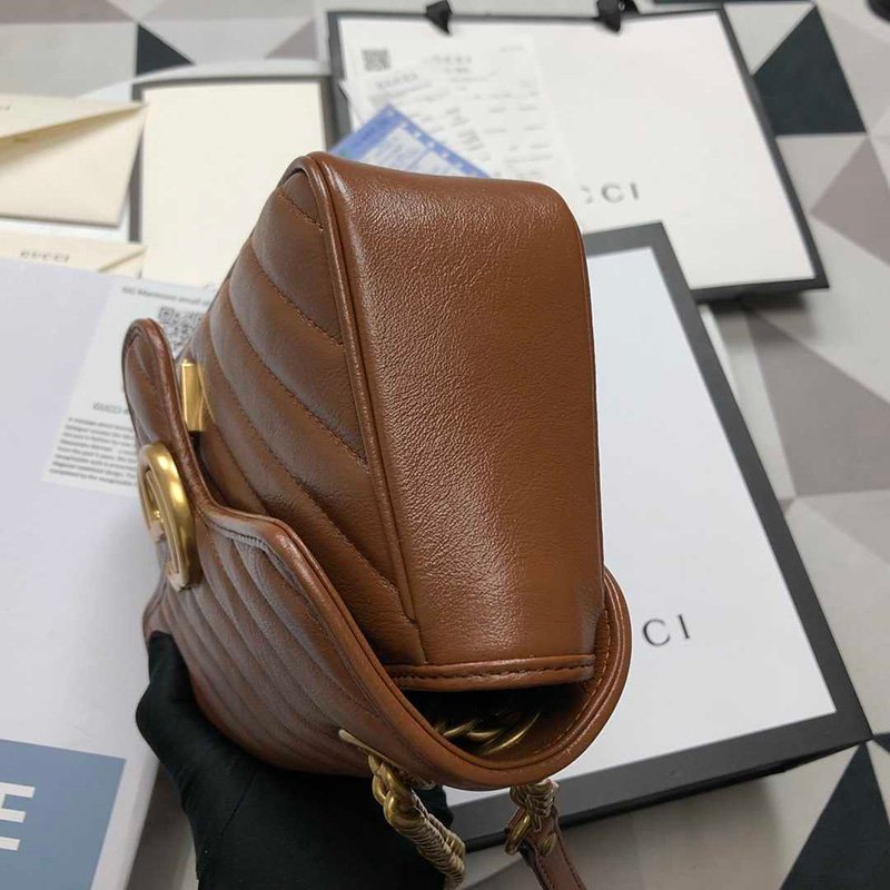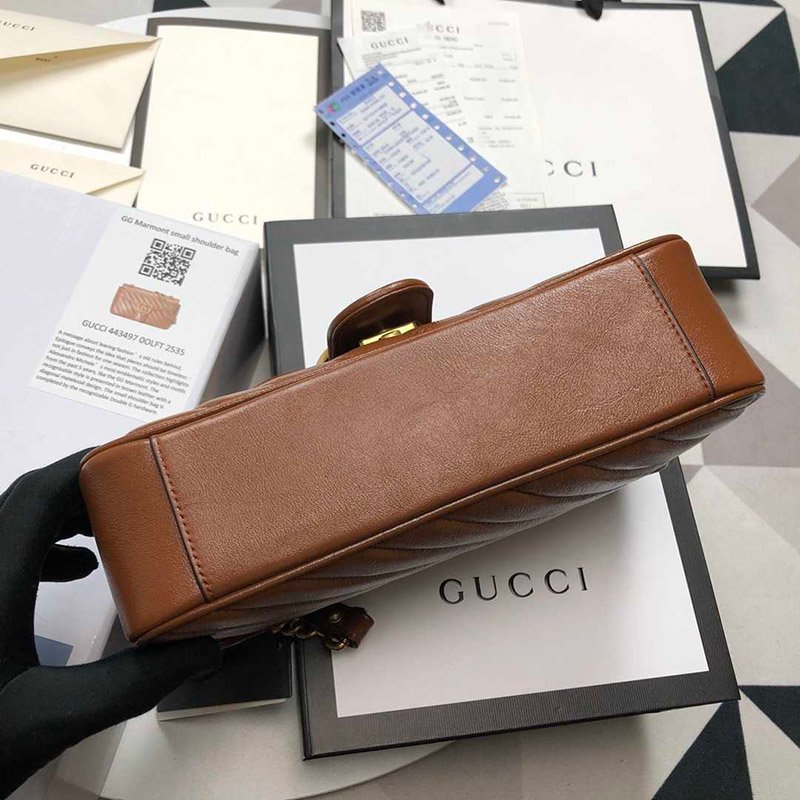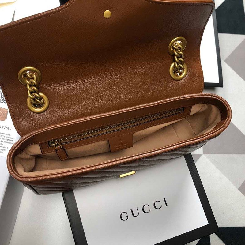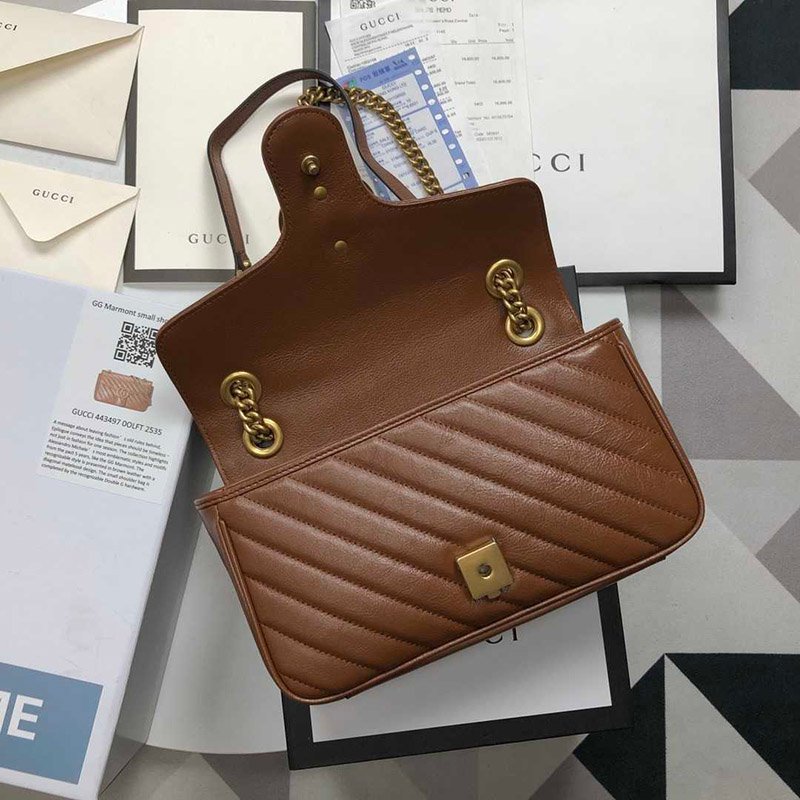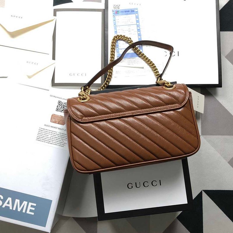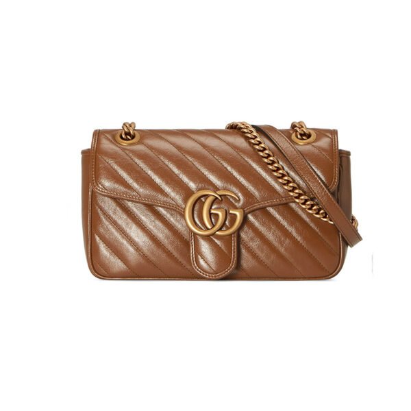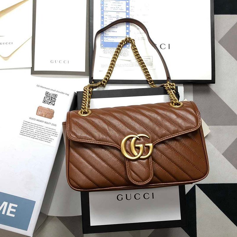Top Quality Replica Bag Product Details Style 443497 0OLFT 2535 Brown diagonal matelass? leather Antique gold-toned hardware Microfiber lining with a suede-like finish Double G Interior zipper pocket Sliding chain strap can be worn as a shoulder strap with 22? drop, as a top handle with 12? drop or as a cross body bag. Flap […]