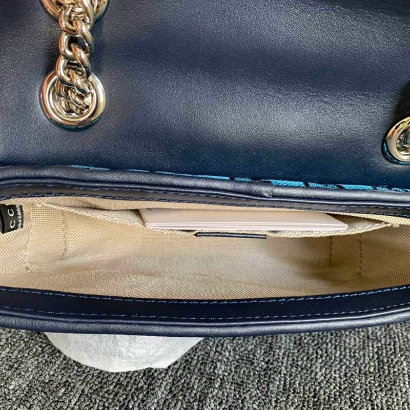 Sliding chain strap can be worn as a shoulder strap with 22? drop, as a top handle with 12? drop or as a cross body bag.