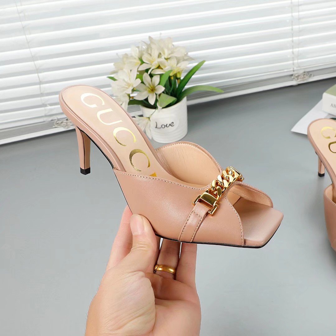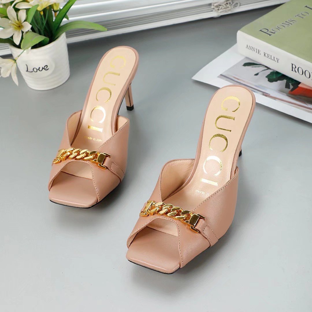 1:1 REPLICA SHOES Pink-tone Leather Slip-on style Chain-link detailing Open toe Square toe Mid heel Branded insole