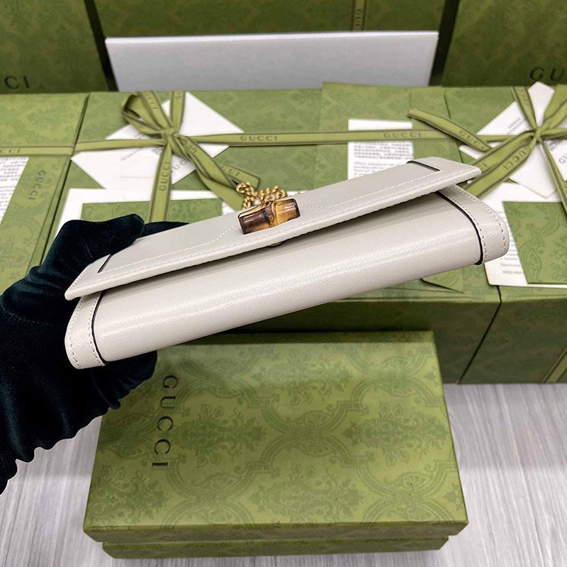 Paying homage to a material at the heart of Gucci?s heritage, this wallet is defined by its bamboo closure. Crafted from smooth white leather, the accessory is completed by Guccio Gucci’s monogram hardware and a delicate chain strap.