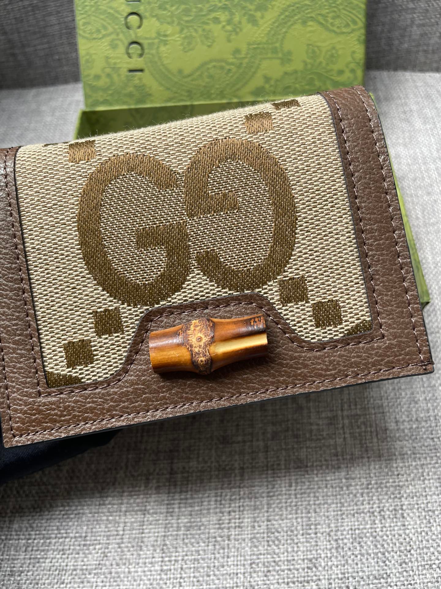 1:1 Replica Wallets Measurements: 11 x 9cm/4.3 x 3.5 inches Double G Camel and ebony jumbo GG canvas Brown leather trim Bamboo detail Viscose lining 5 card slots, open pocket and zipper pocket