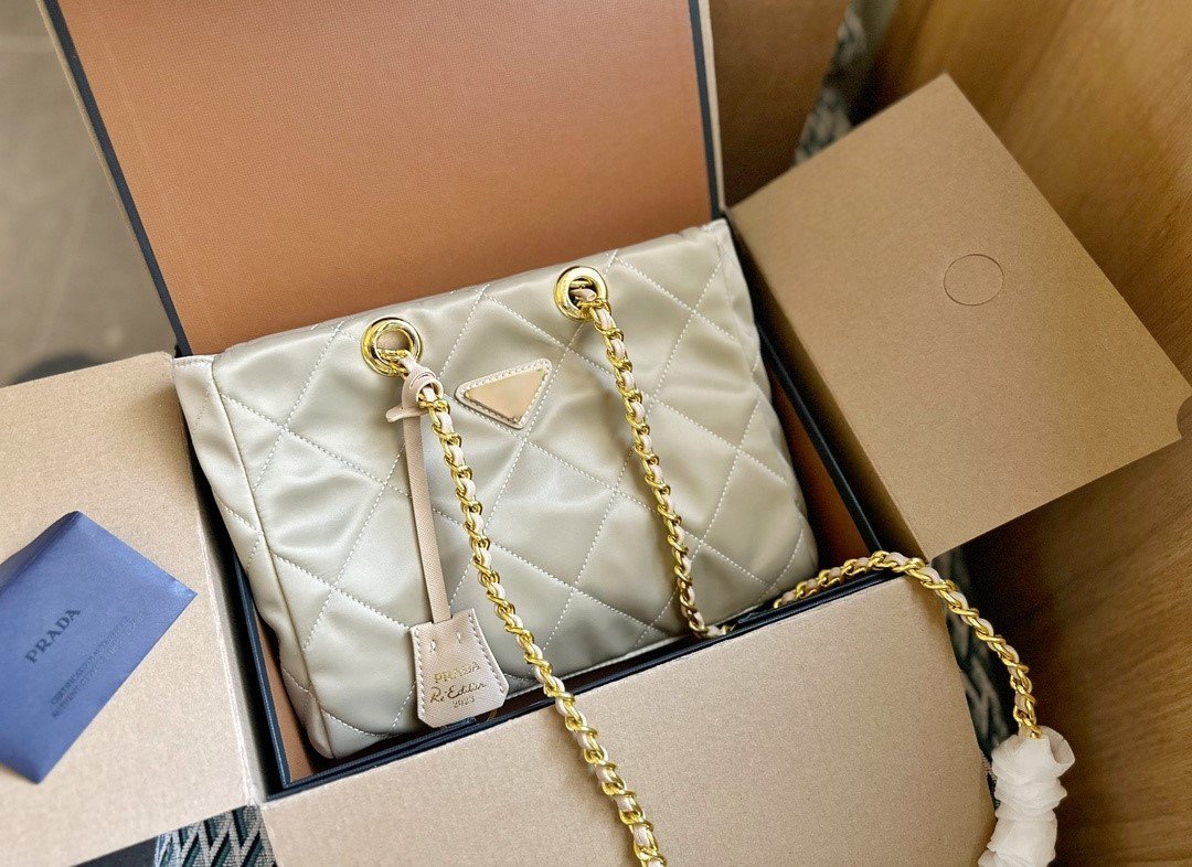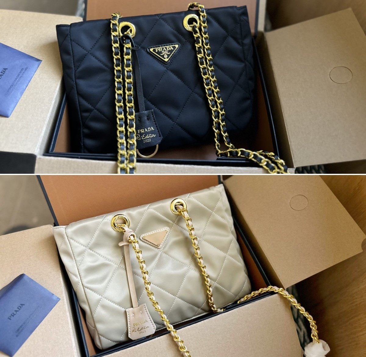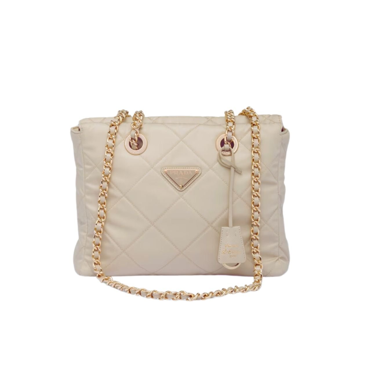 1:1 Replica Bags Measurements: 27 cm / 10.6 inches Beige Lightly padded and top-stitched Leather-threaded chain handles Metal hardware Enameled metal triangle logo on the front Zipper closure Logo-print Re-Nylon lining with zipper pocket