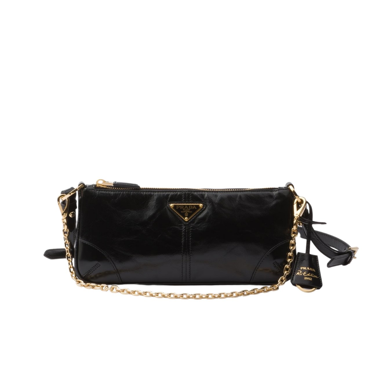 1:1 Replica Bags Measurements: 23 cm / 9 inches Brushed leather details Removable chain handle Shoulder strap Removable leather key chain Metal hardware Enameled metal triangle logo on the front Zipper closure Logo-print nylon lining