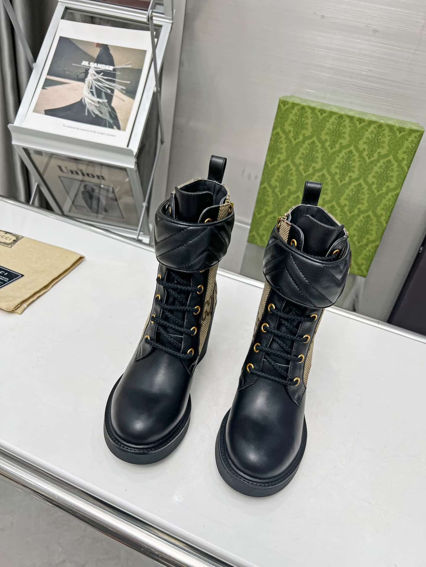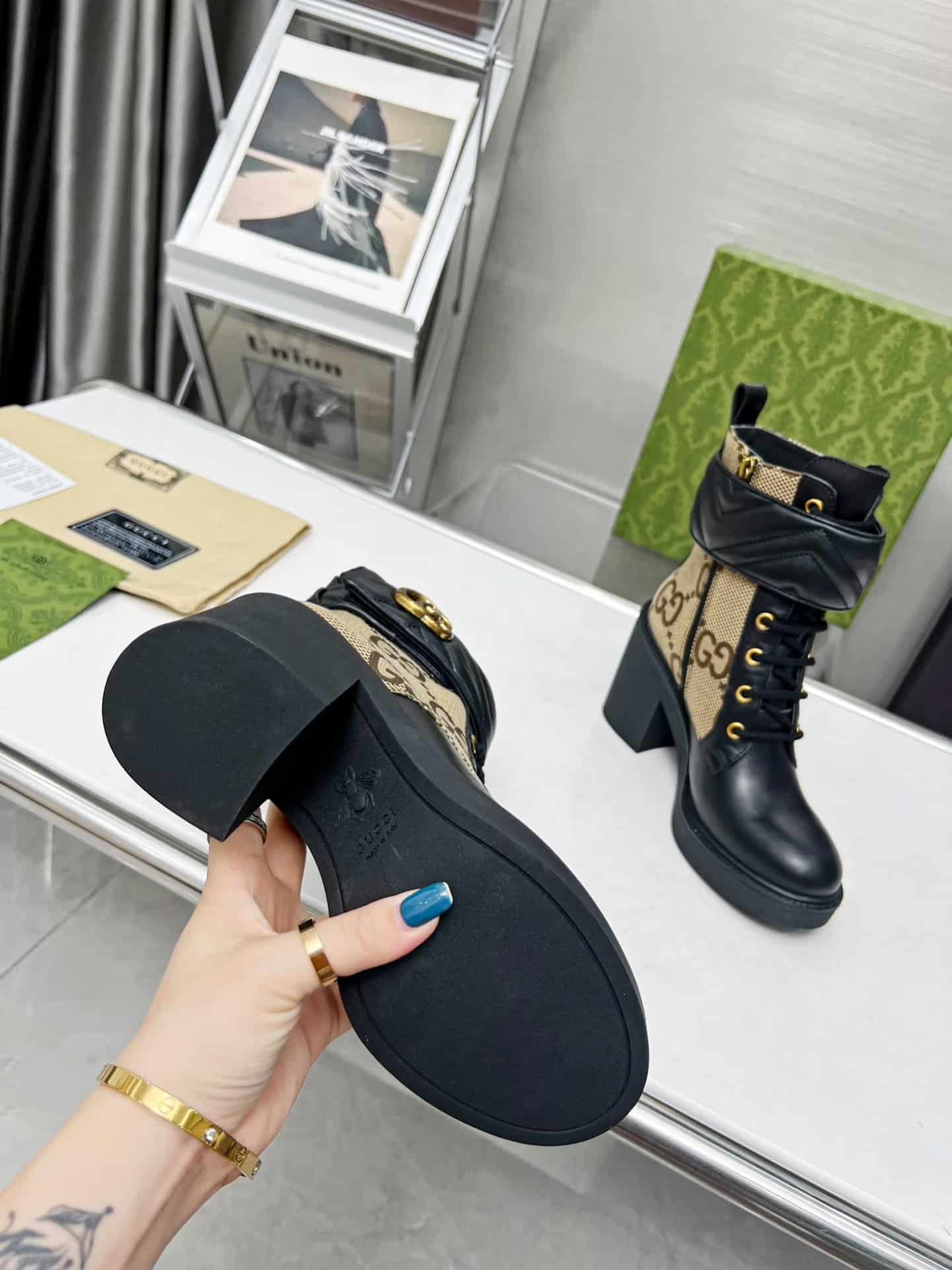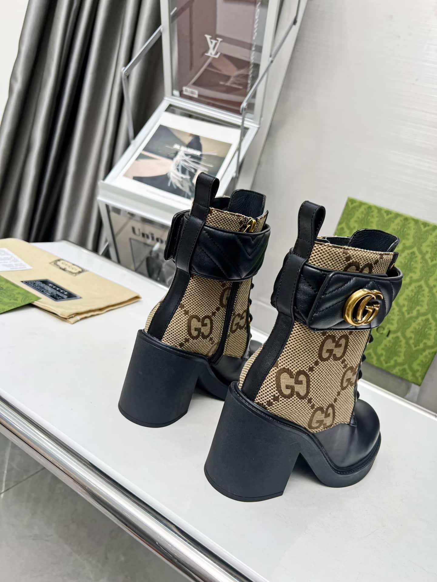 1:1 Replica Shoes Beige and ebony maxi GG canvas with black leather details Tonal matelass? trim Double G Leather sole Lace-up and ankle zip closure Low-heel
