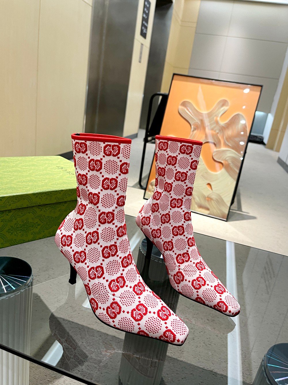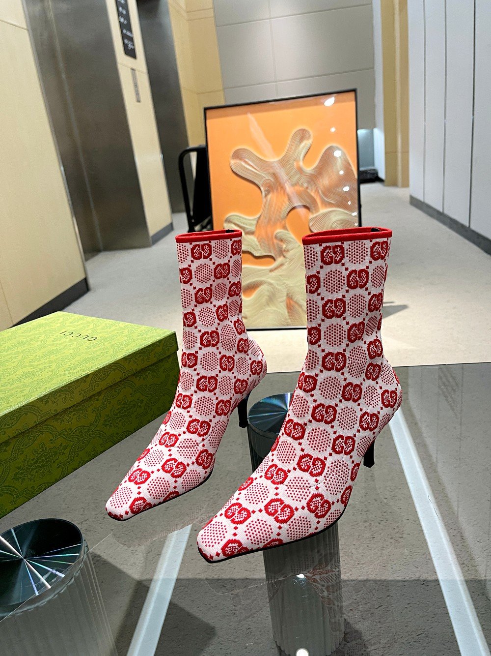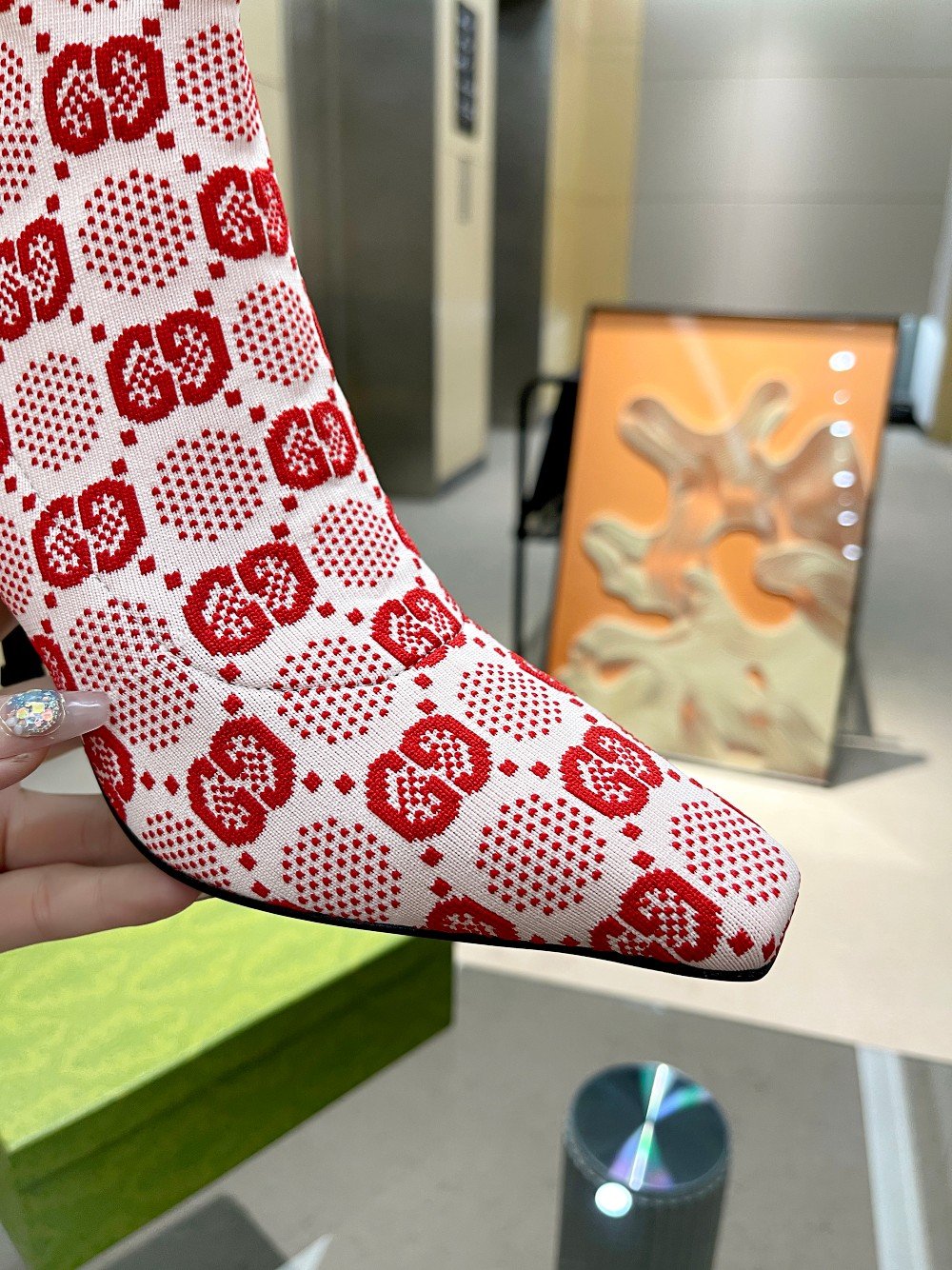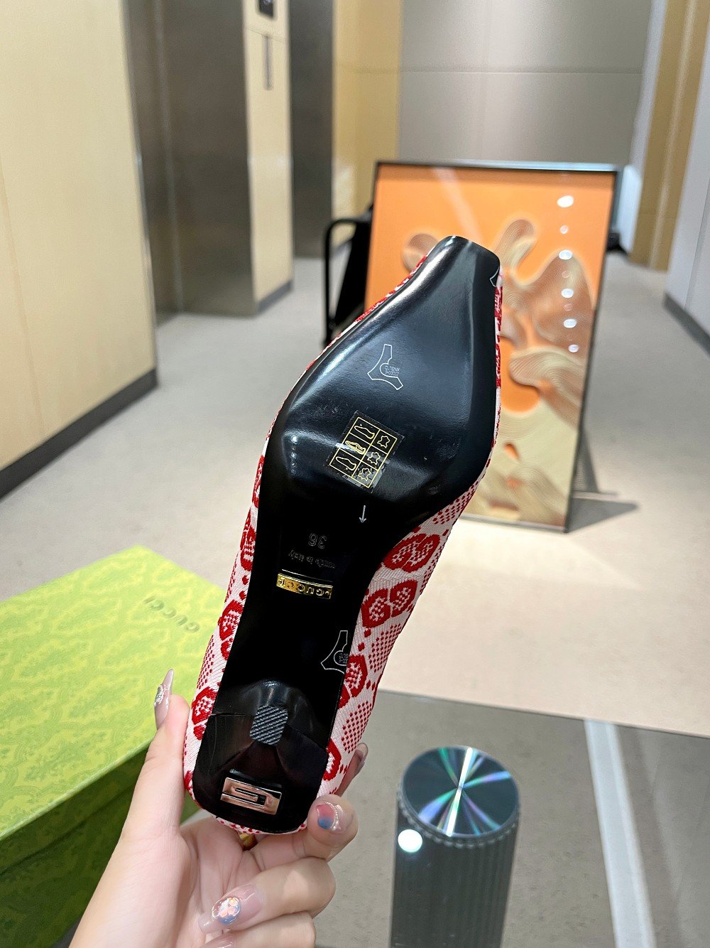 1:1 Replica Shoes White and red GG technical knit fabric Square toe Square G metal detail Leather sole Mid-heel