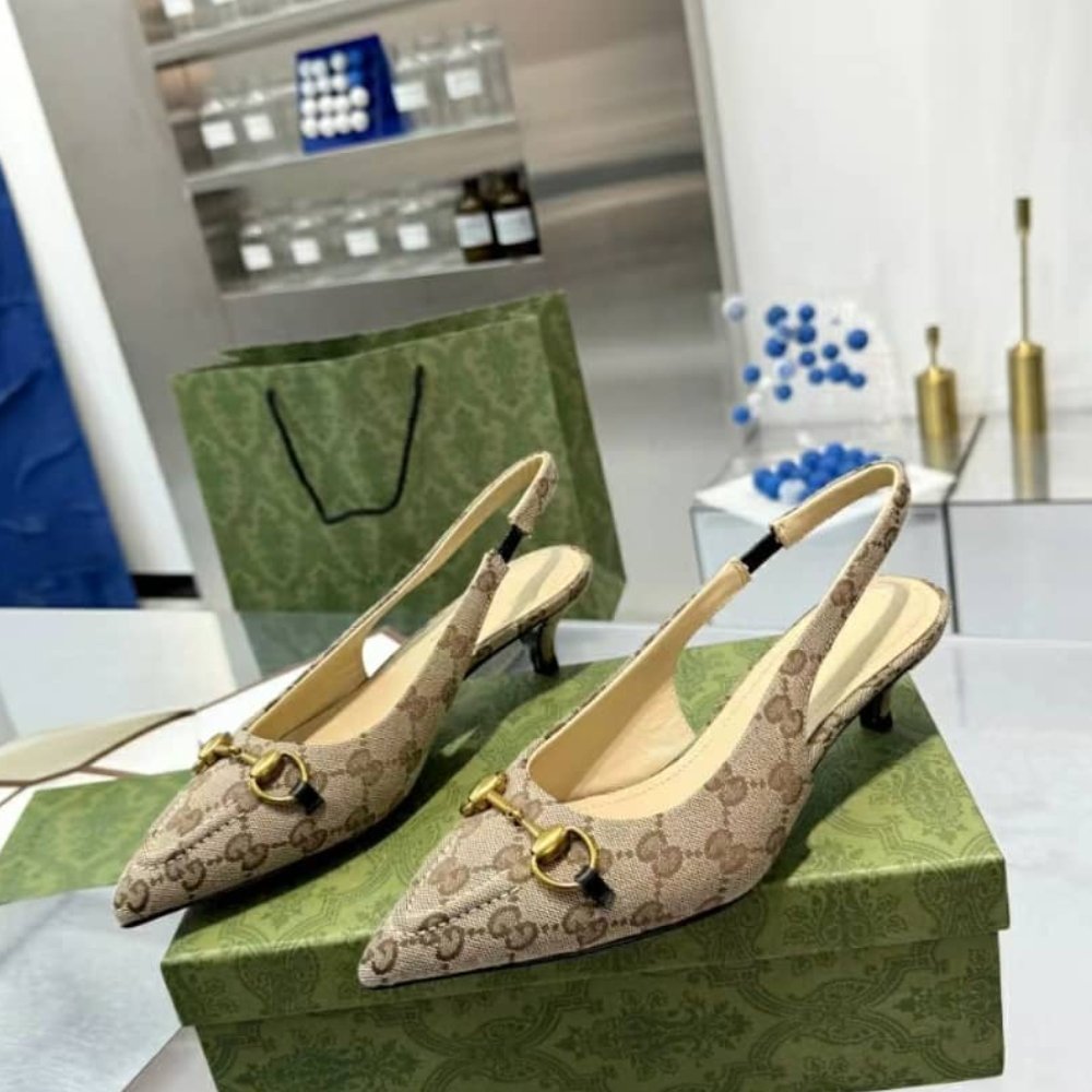 1:1 REPLICA SHOES Beige and ebony Original GG canvas Women’s Brown leather trim Light gold-toned hardware Horsebit Point toe Elastic strap Low heel