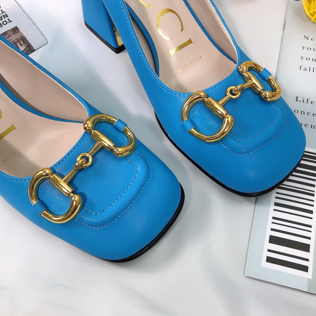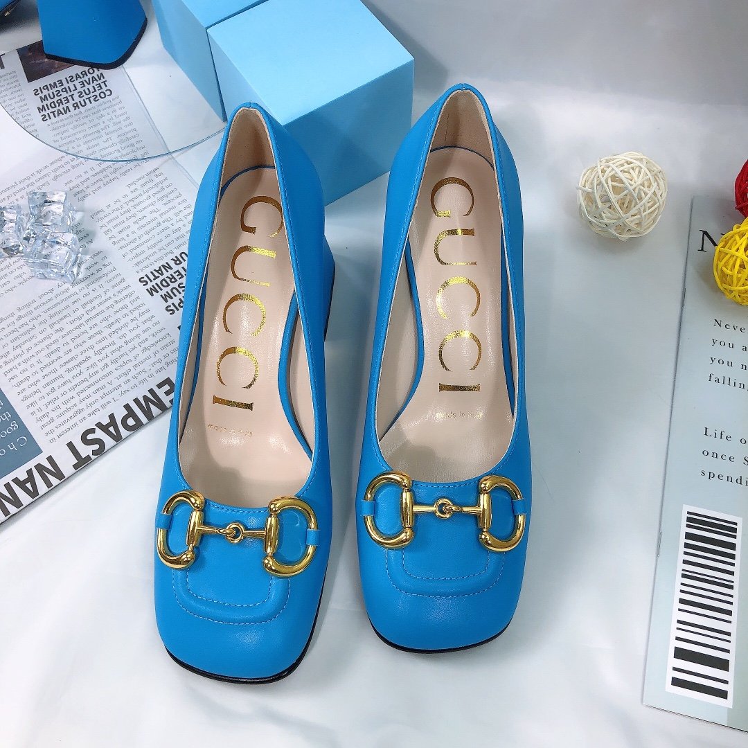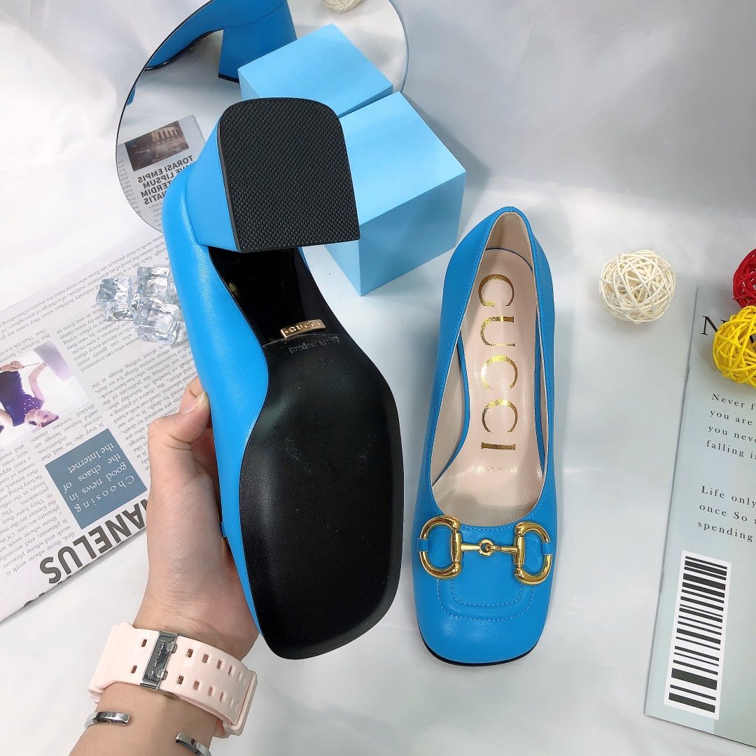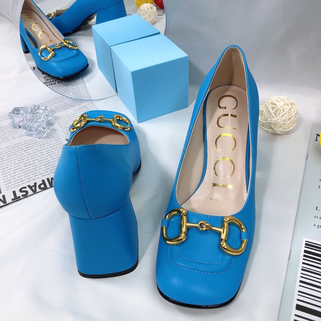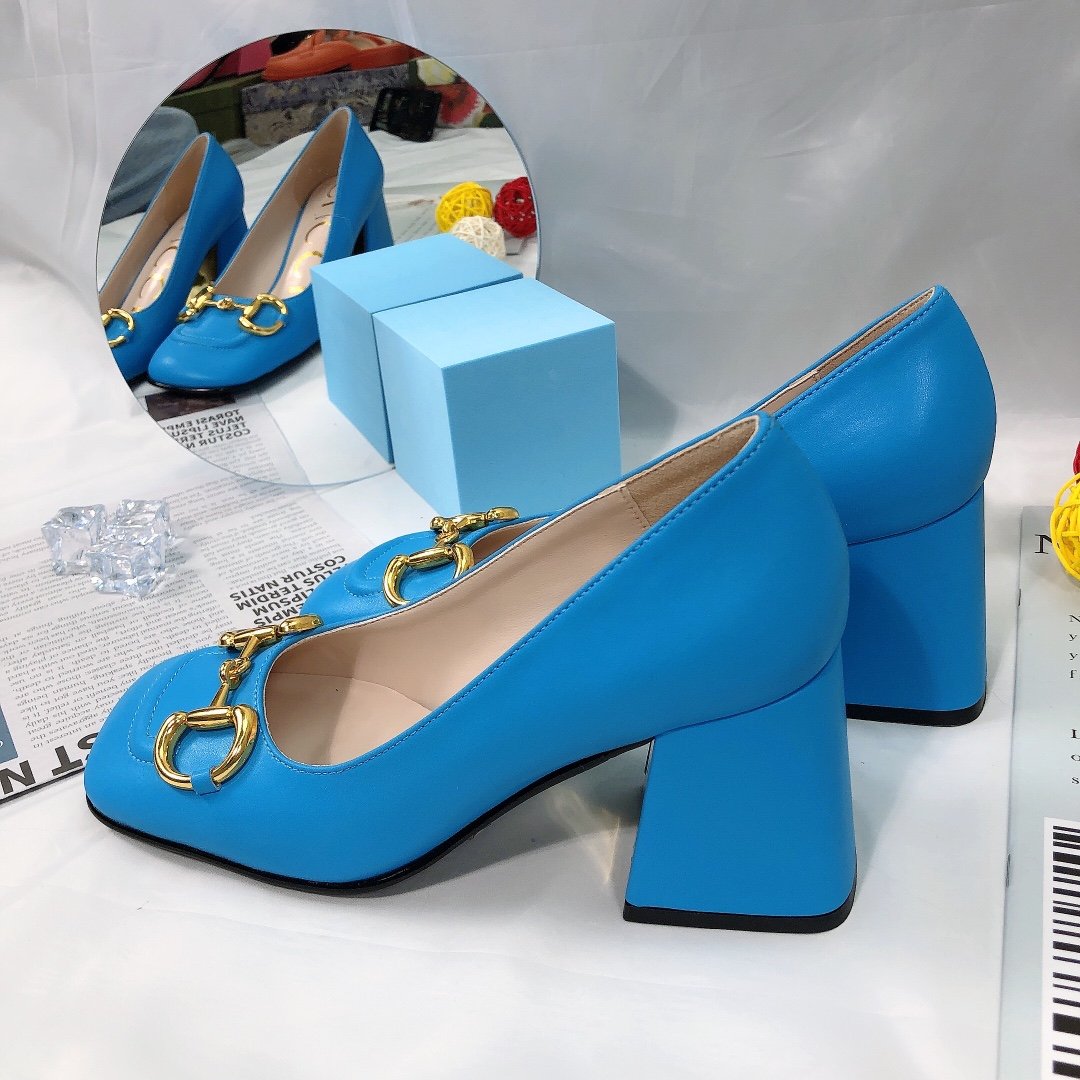 1:1 REPLICA SHOES Blue leather Women’s Horsebit detail Sculpted block heel Leather sole Mid-heel