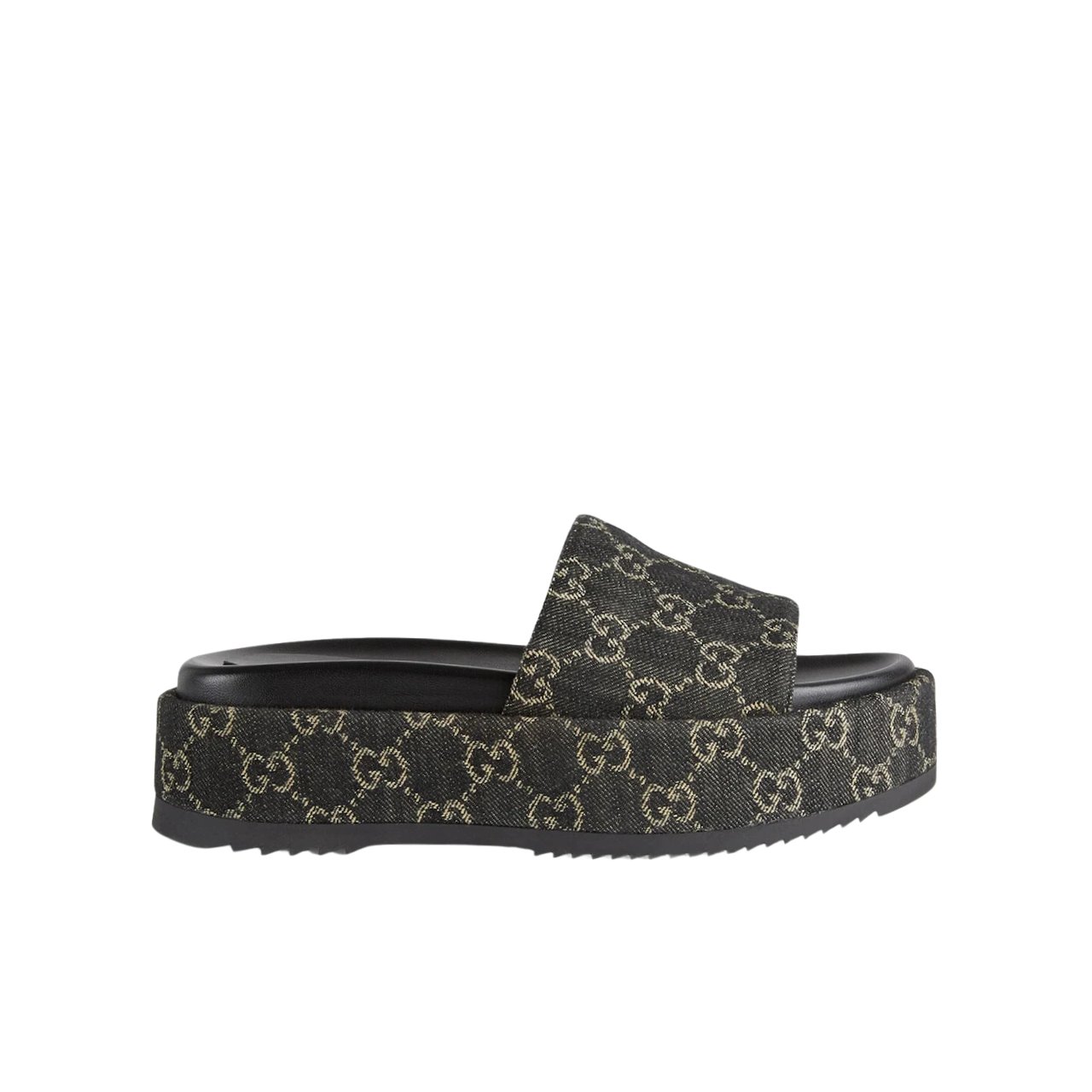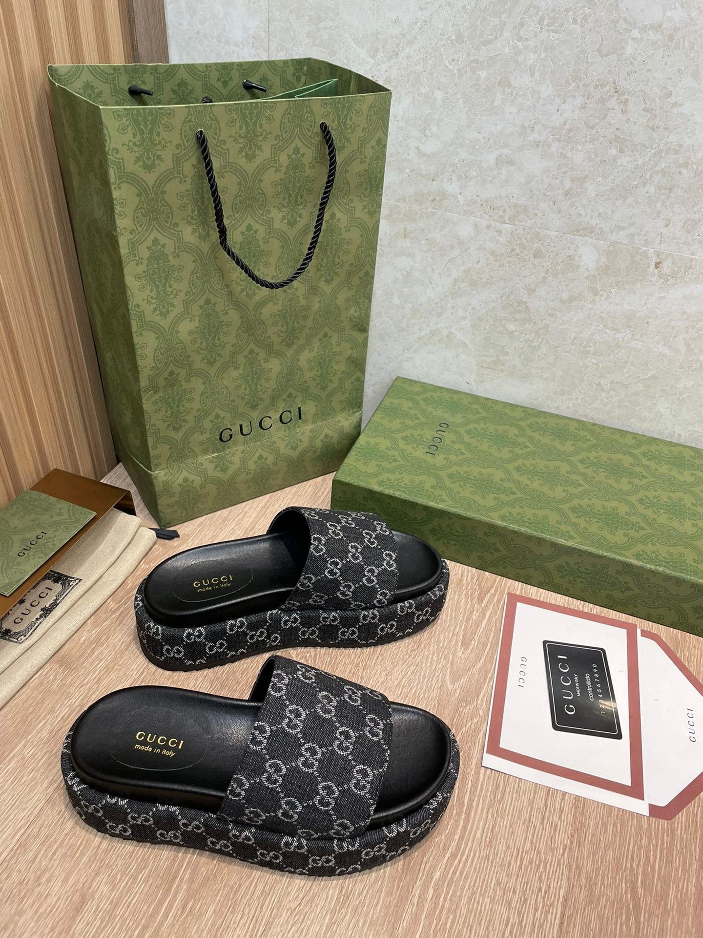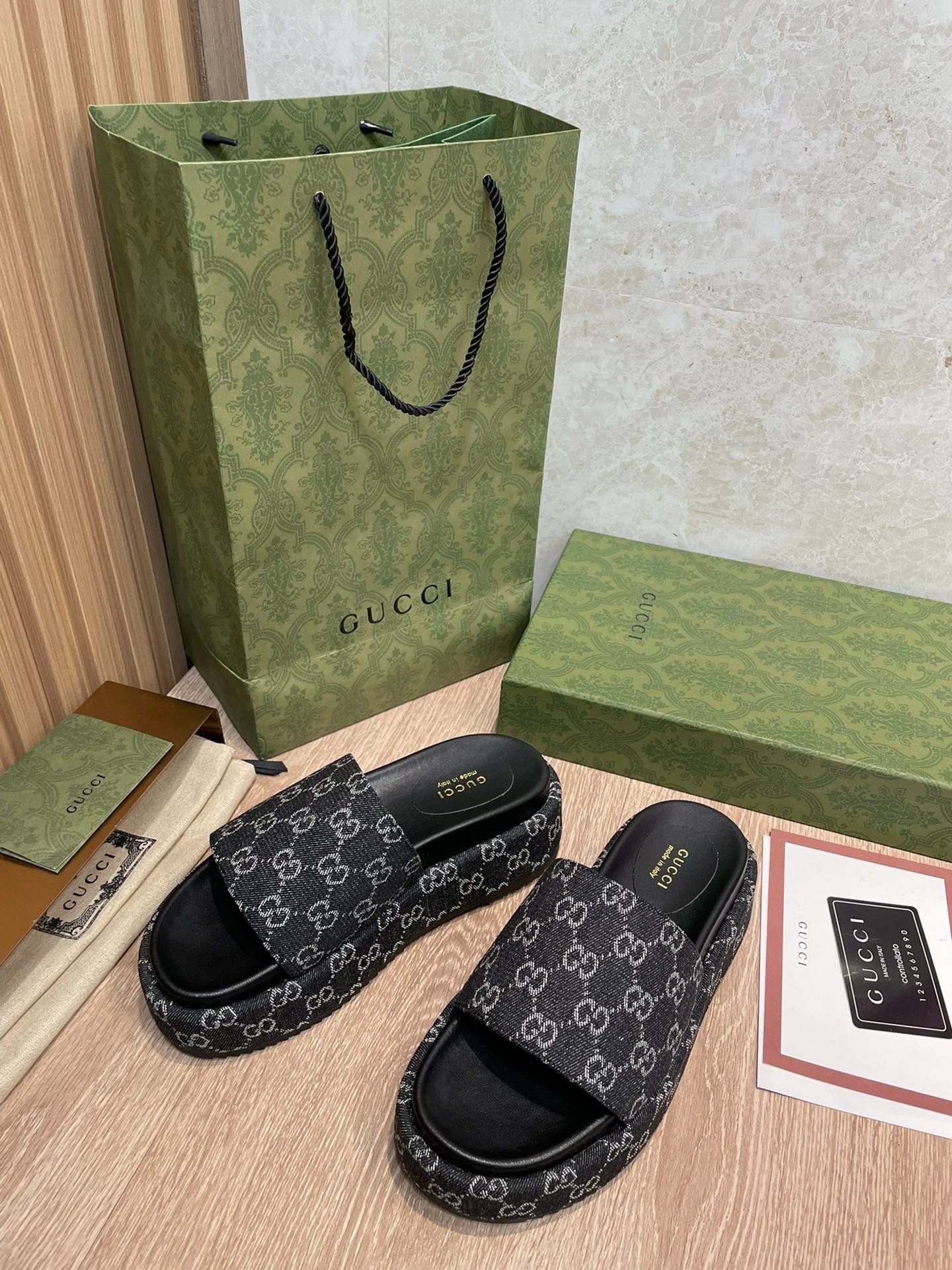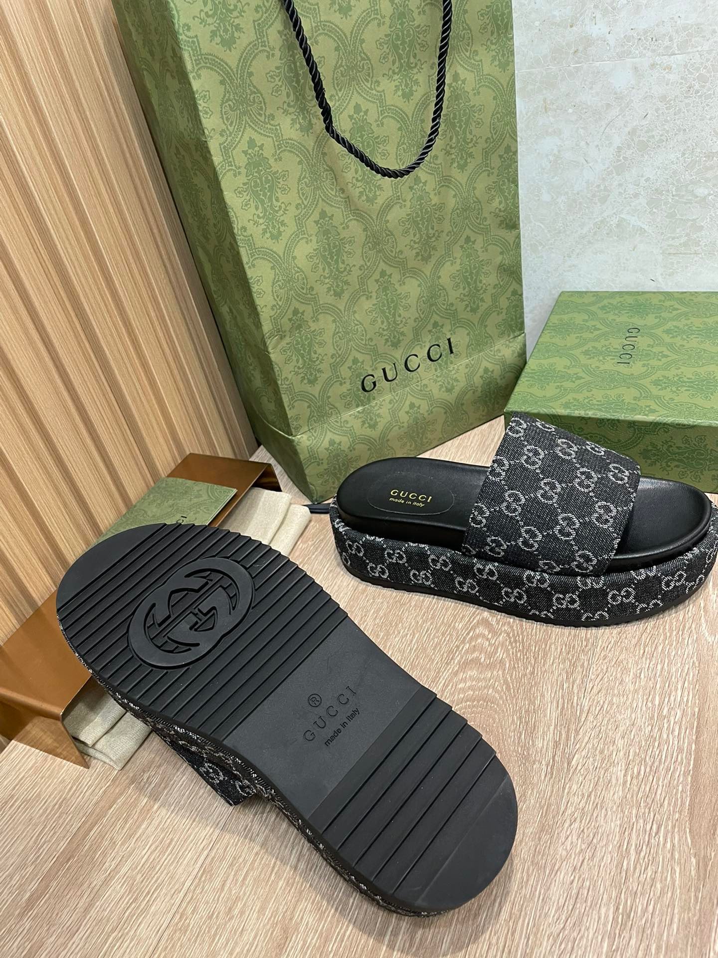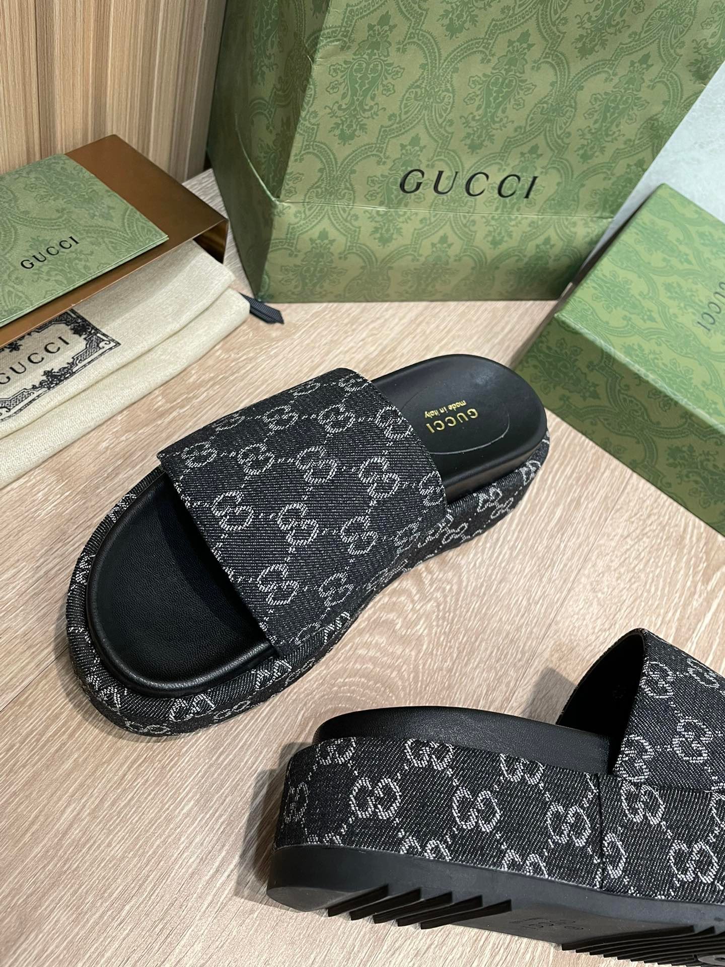 1:1 REPLICA SHOES Black and ivory GG denim Women?s Platform sole with rubber bottom Mid-heel
