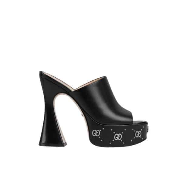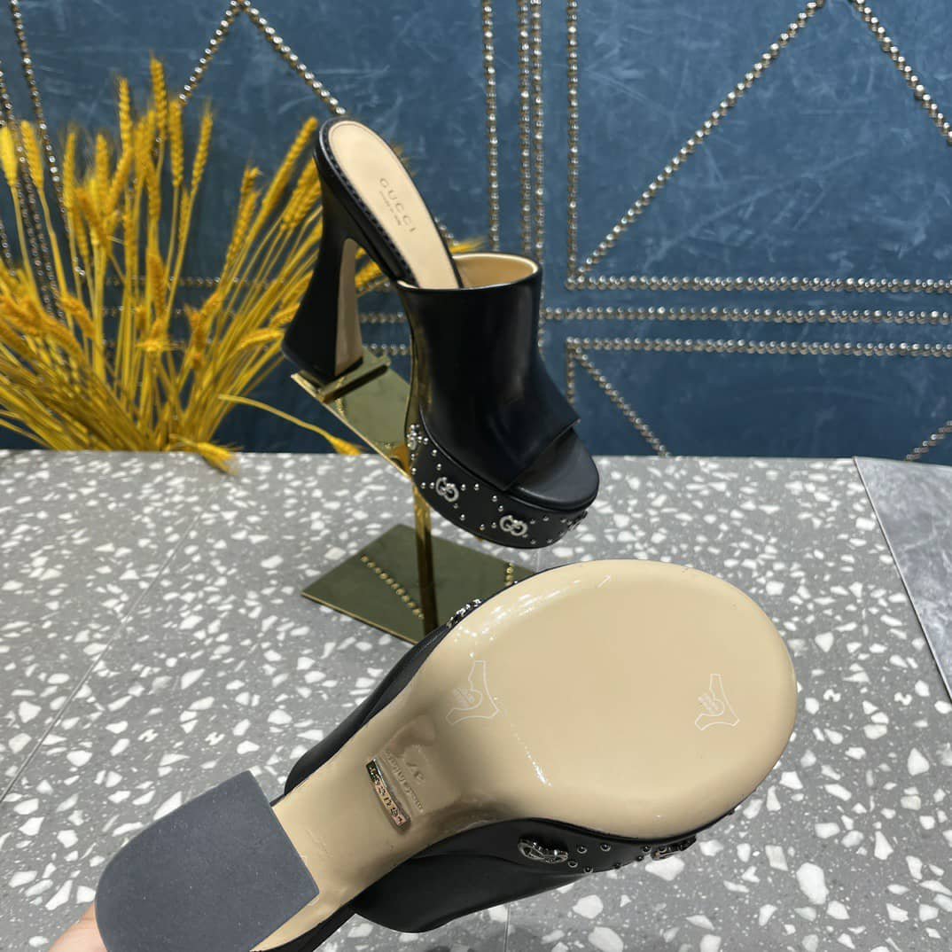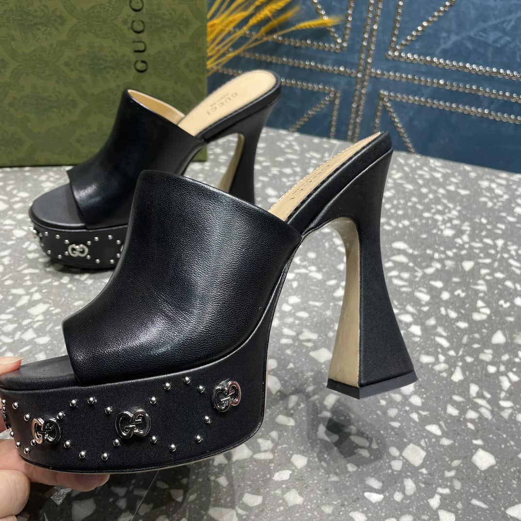 1:1 Replica Shoes Black leather Women’s Spool heel GG studs Leather sole High heel