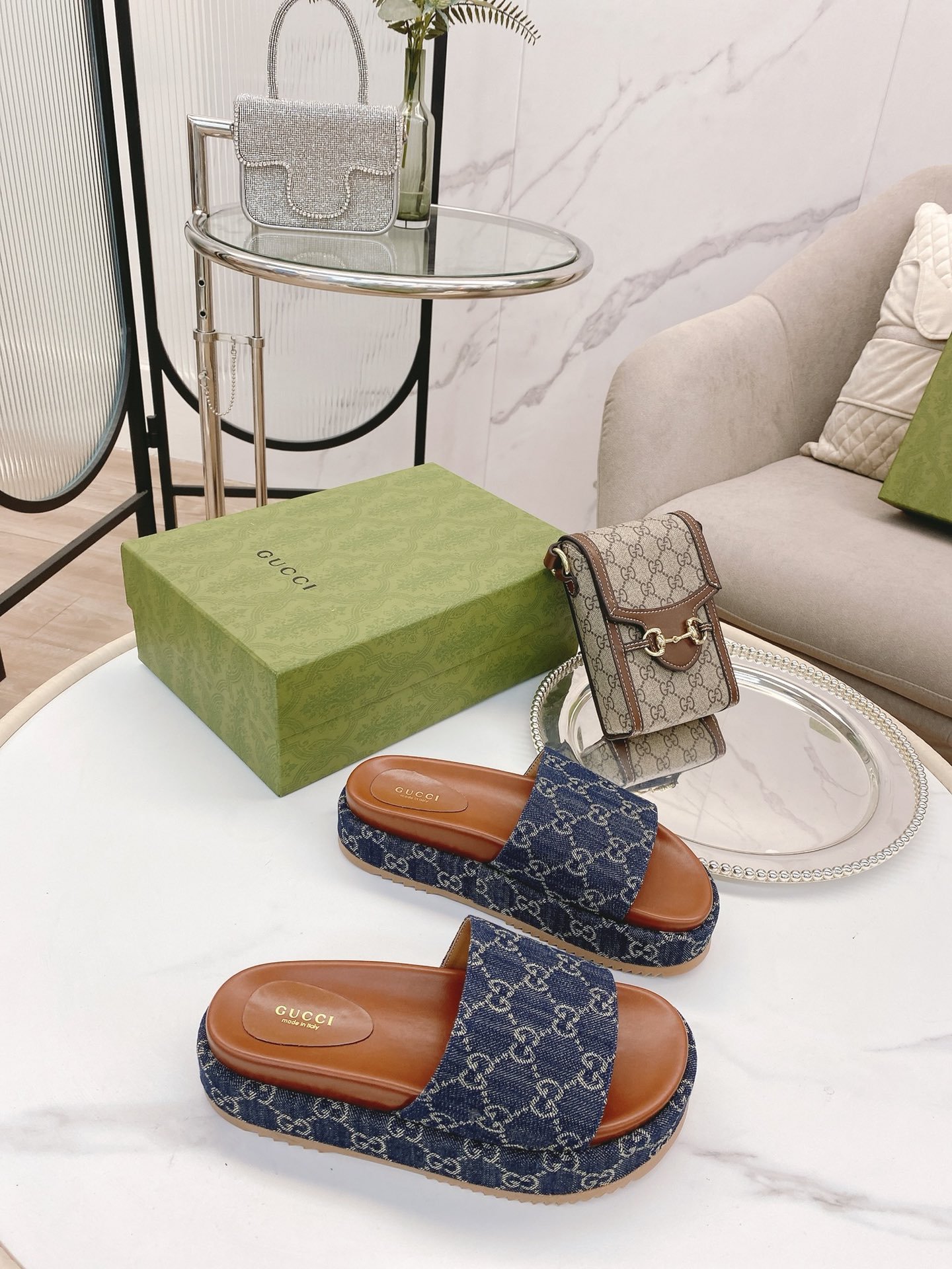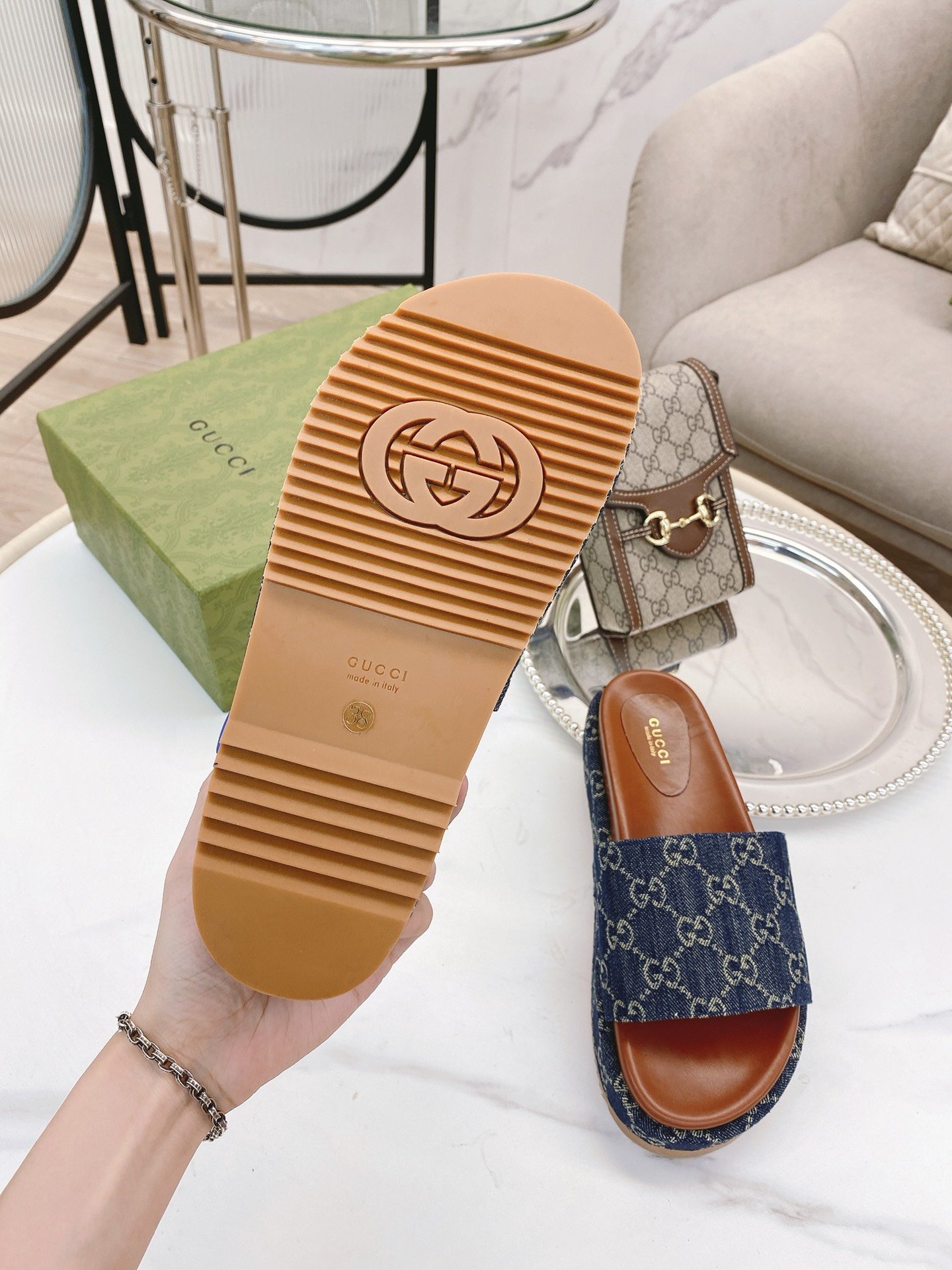1:1 REPLICA SHOES Dark blue and ivory eco washed organic GG jacquard denim Women’s Platform sole with rubber bottom Mid-heel