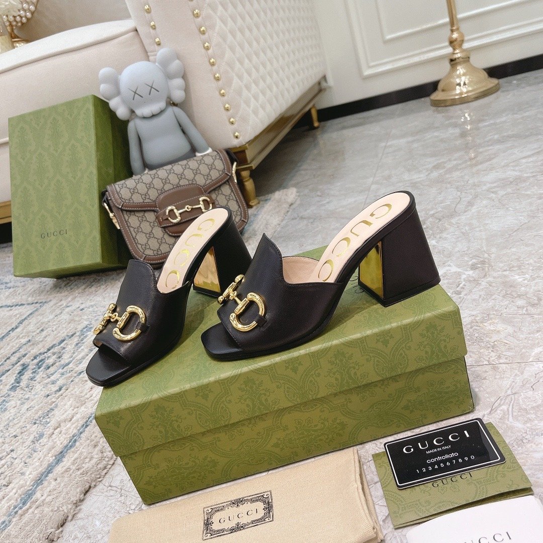 1:1 REPLICA SHOES Black leather Women’s Gold-toned hardware Horsebit Metal detail at heel Leather sole Mid-heel