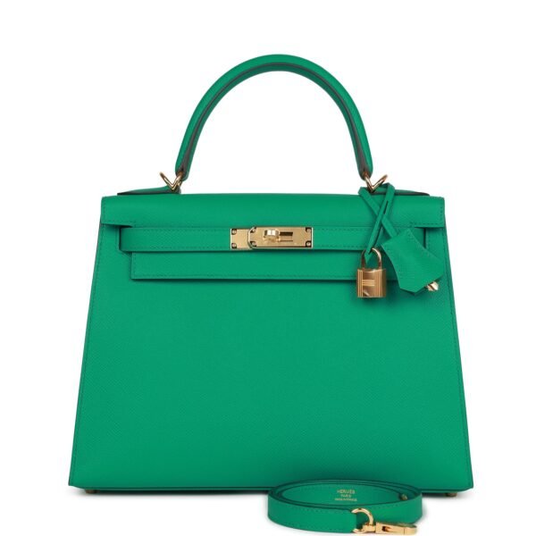 This Kelly, in the Sellier style, is in Vert Jade epsom leather with gold hardware and has tonal stitching, front flap, two straps with center toggle closure, clochette with lock and two keys a single rolled handle and removable shoulder strap.