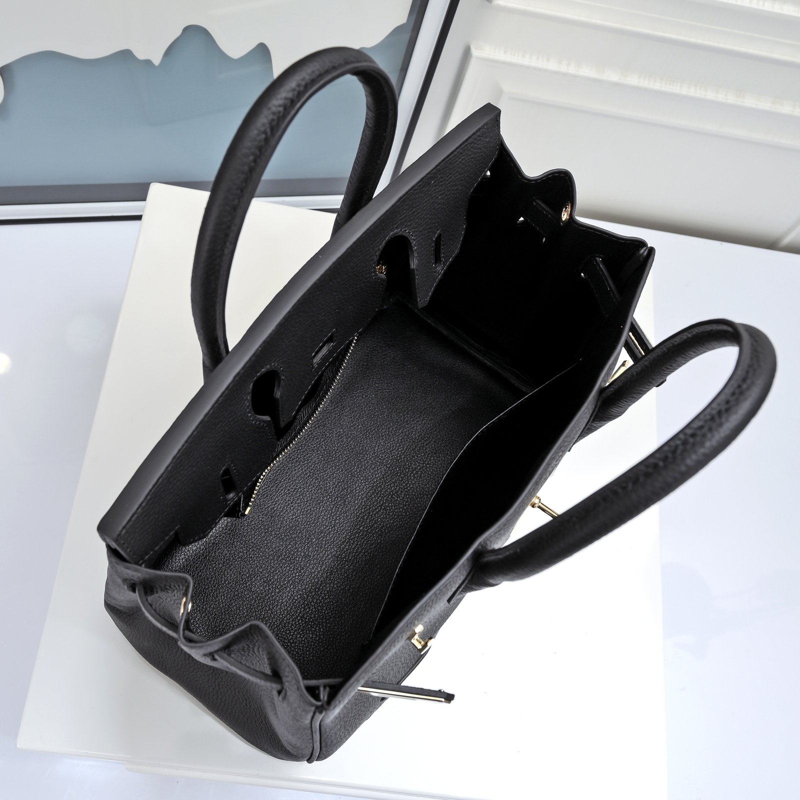 The interior is lined with Etain chevre and has one zip pocket with an Hermes engraved zipper pull and an open pocket on the opposite side.