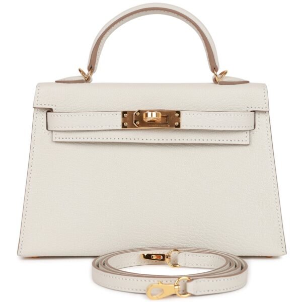 This Kelly, in the Sellier style, is in Mushroom chevre leather with gold hardware and has tonal stitching, two straps with front toggle closure, single rolled handle and removable shoulder strap.