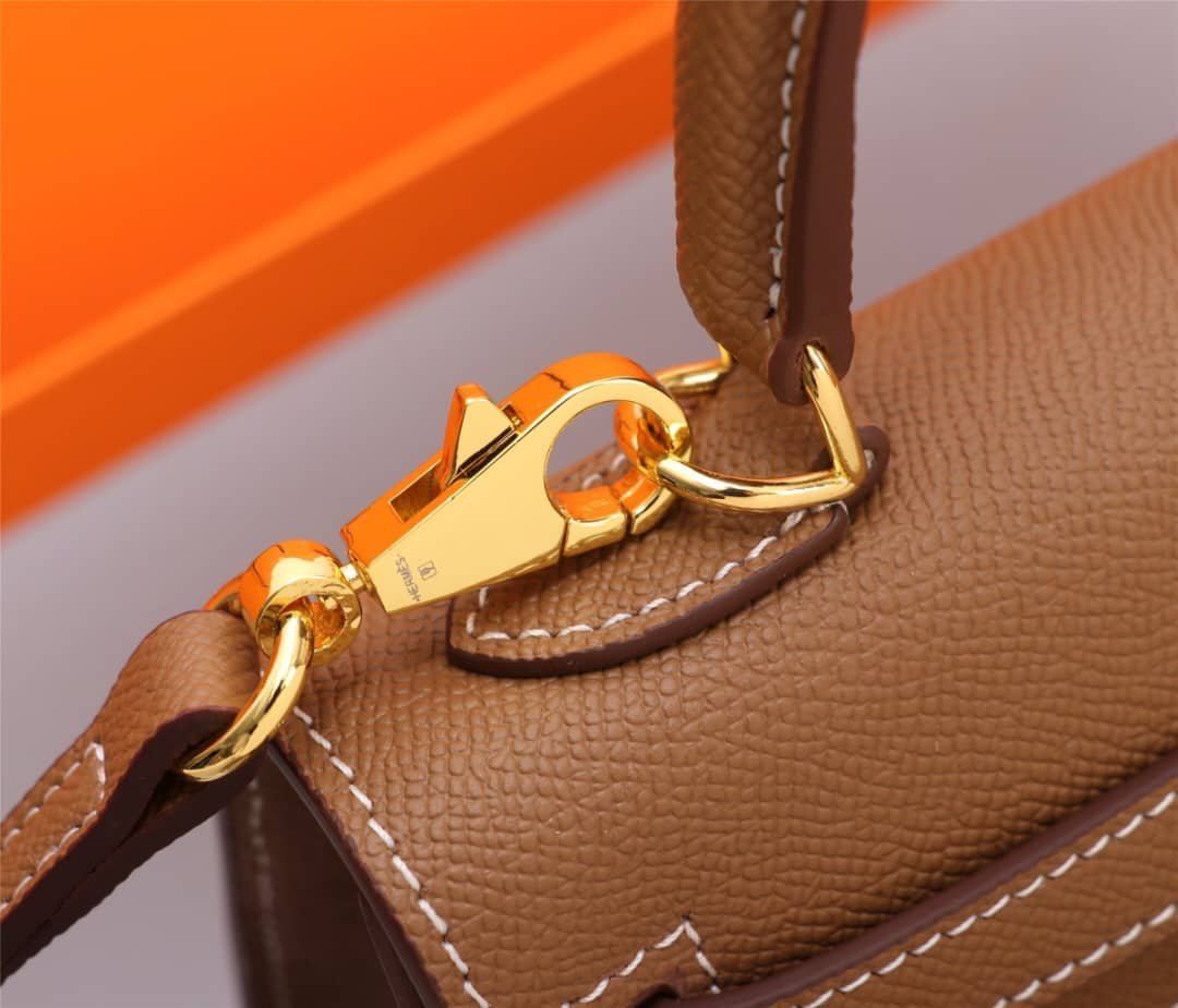 This Kelly, in the Sellier style, is in Chai epsom leather with gold hardware and has tonal stitching, front flap, two straps with center toggle closure, clochette with lock and two keys a single rolled handle and removable shoulder strap.