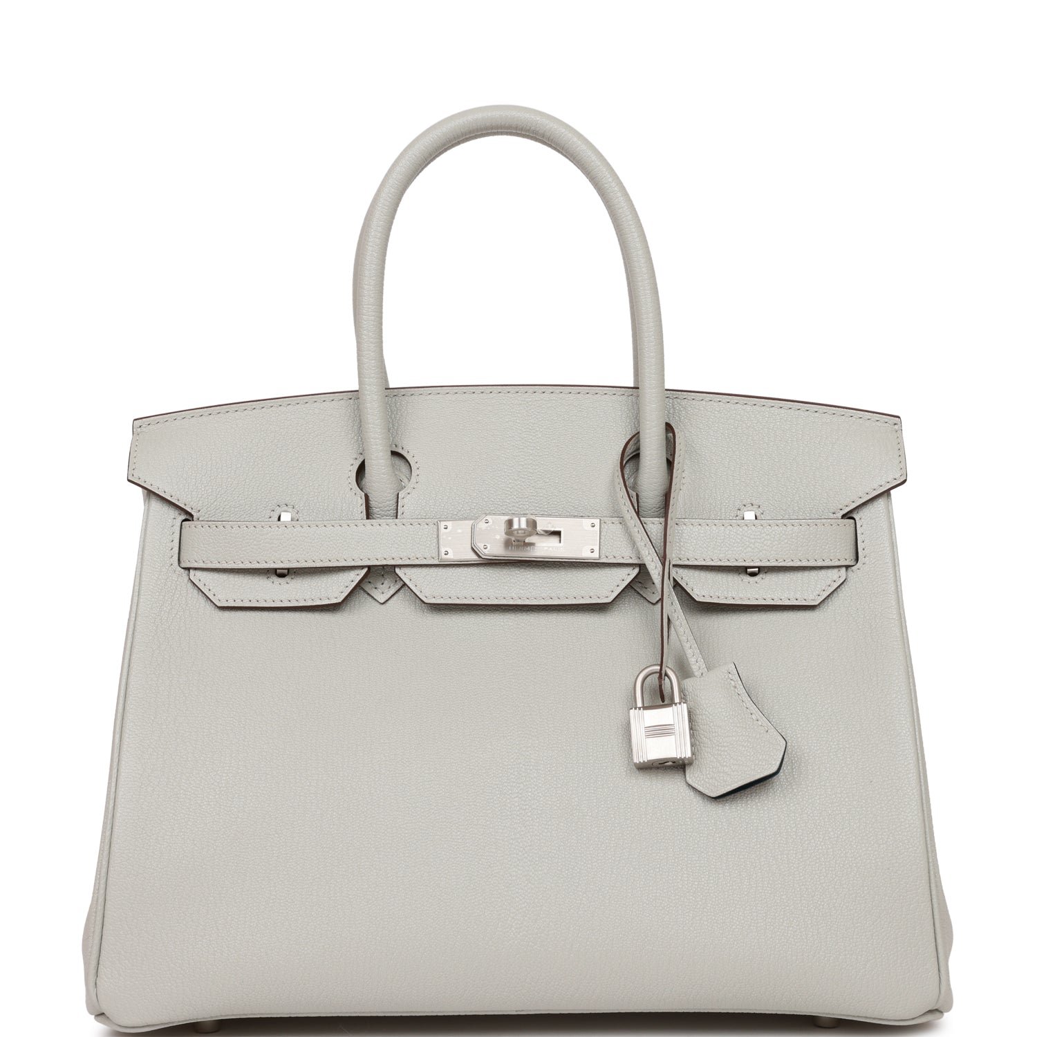 This Special Order Birkin is in Gris Perle chevre leather with brushed palladium hardware and has tonal stitching,front flap, two straps with center toggle closure, clochette with lock and two keys, and double rolled handles.
