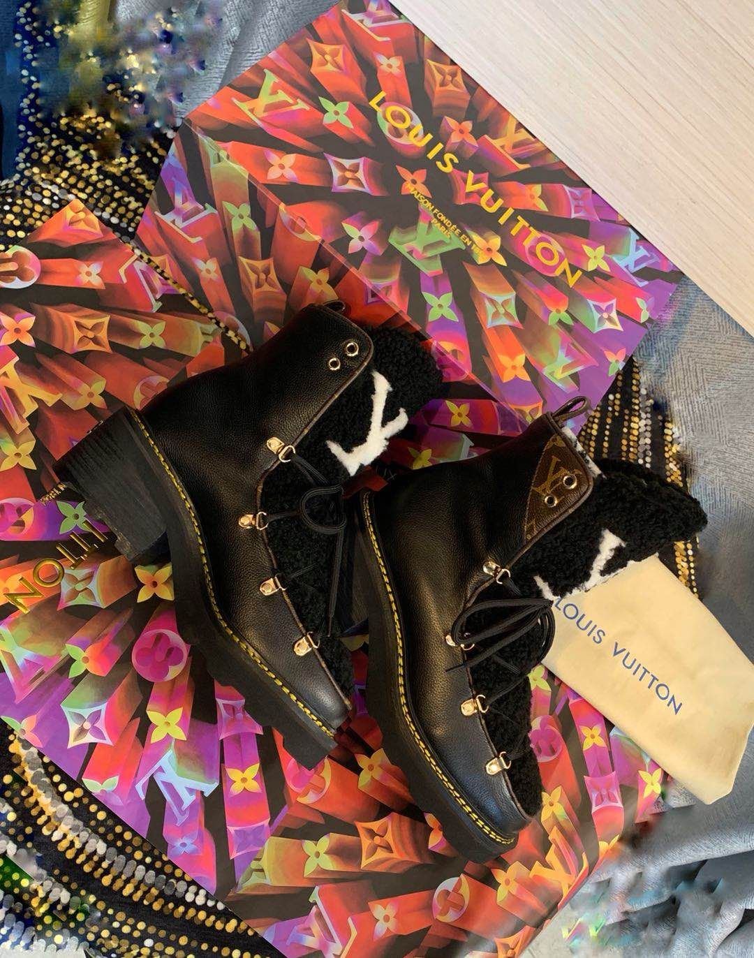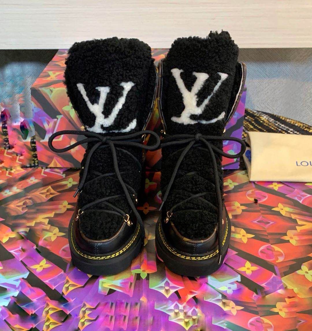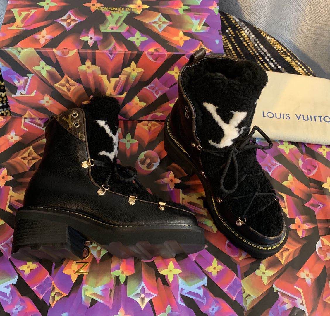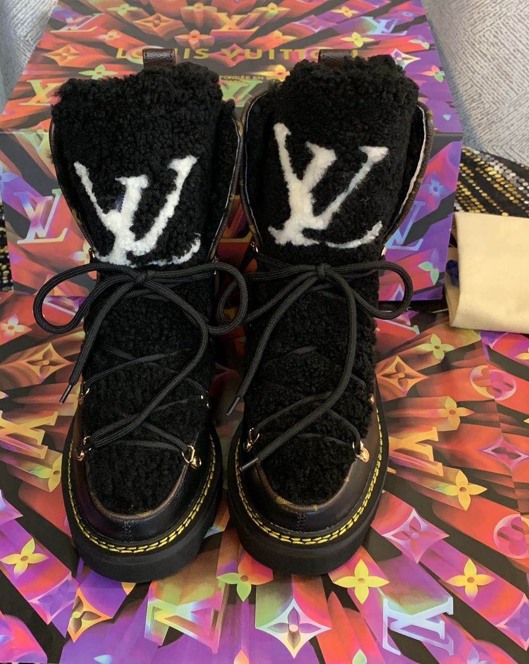 - A warm and cozy wool lining AND a shearling tongue with an oversized LV Initial signature.