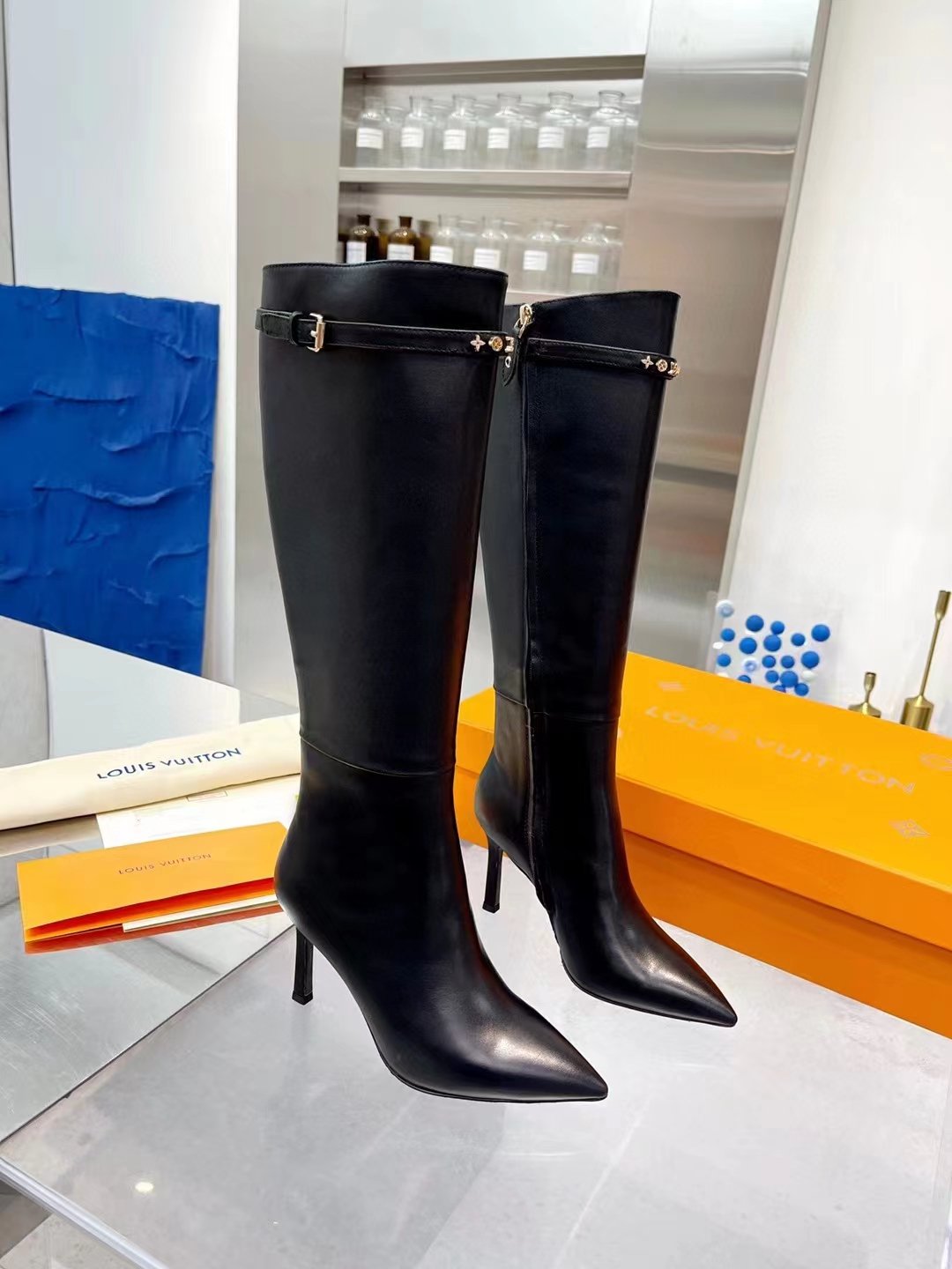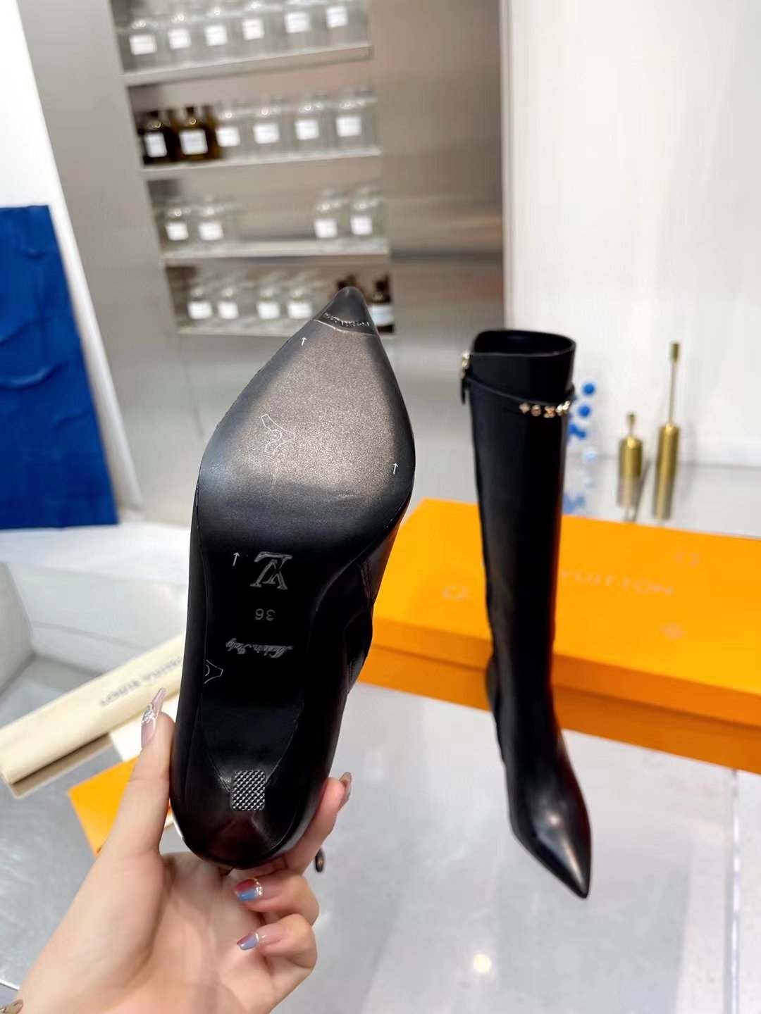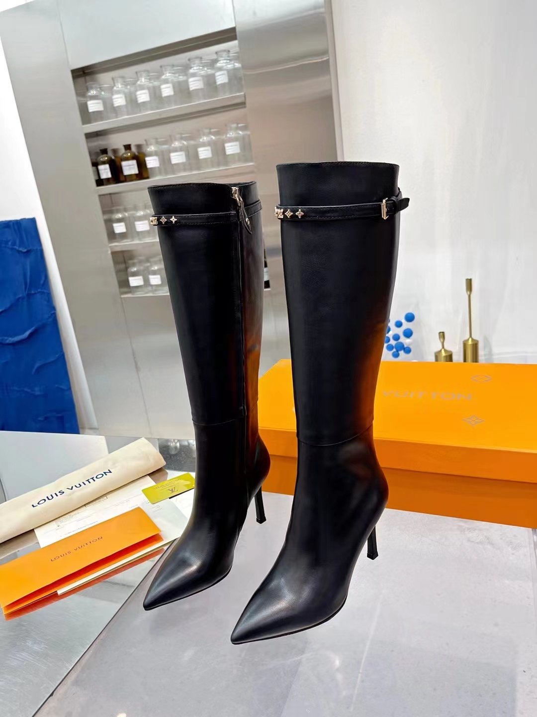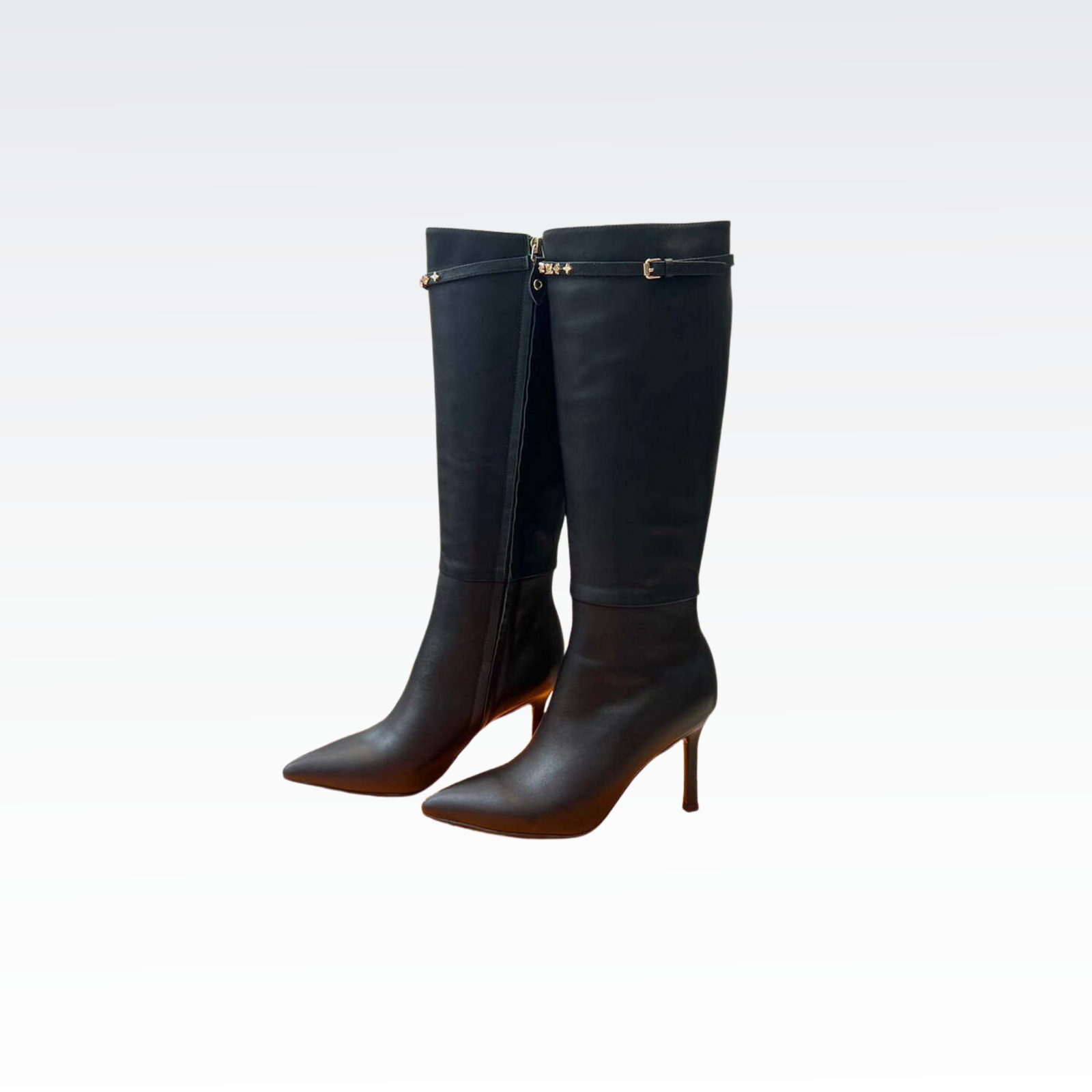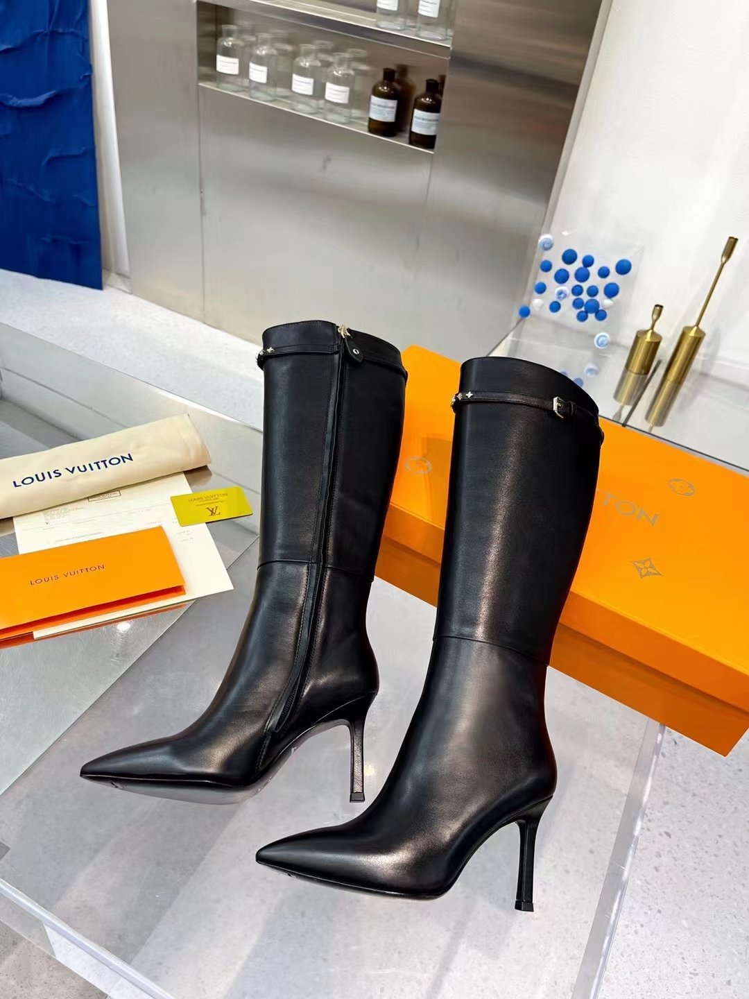 1:1 REPLICA SHOES Calf leather Side zip Leather outsole 8.5 cm / 3-inch heel Monogram studs