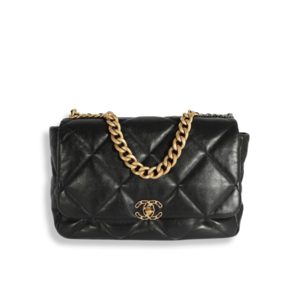 Description: Large 19 shoulder bag from Luxury featuring black. lambskin. diamond quilting. single chain-link top handle. leather and chain-link shoulder strap. front flap closure. signature interlocking turn-lock fastening. main compartment. internal zip-fastening pocket. internal logo plaque. slip pocket to the rear. Dimensions: 10?? width x 6.2?? height x 3.5?? depth; 17.5?? strap drop (3?? handle)