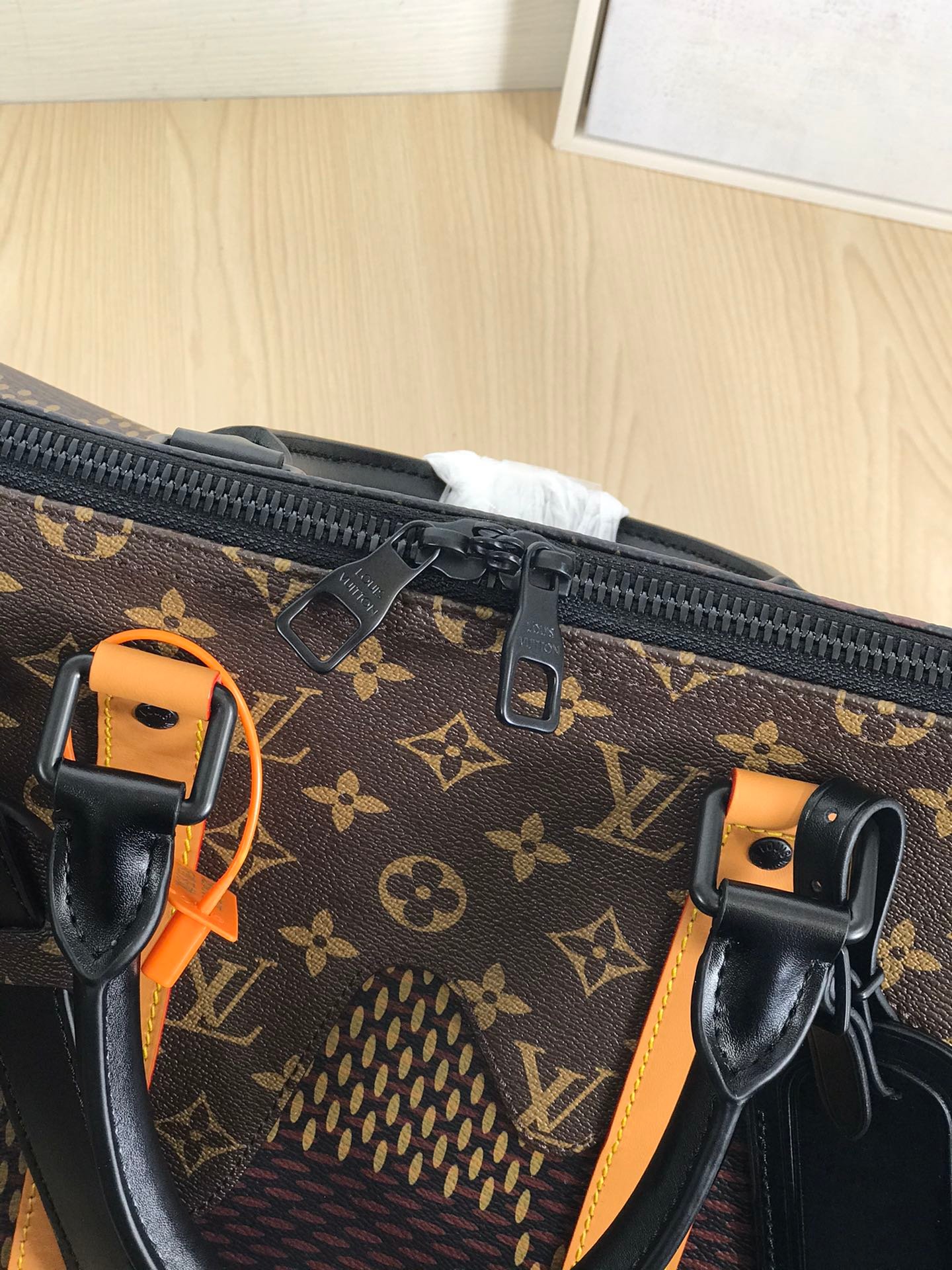 • Black hardware, and a double-zip closure
