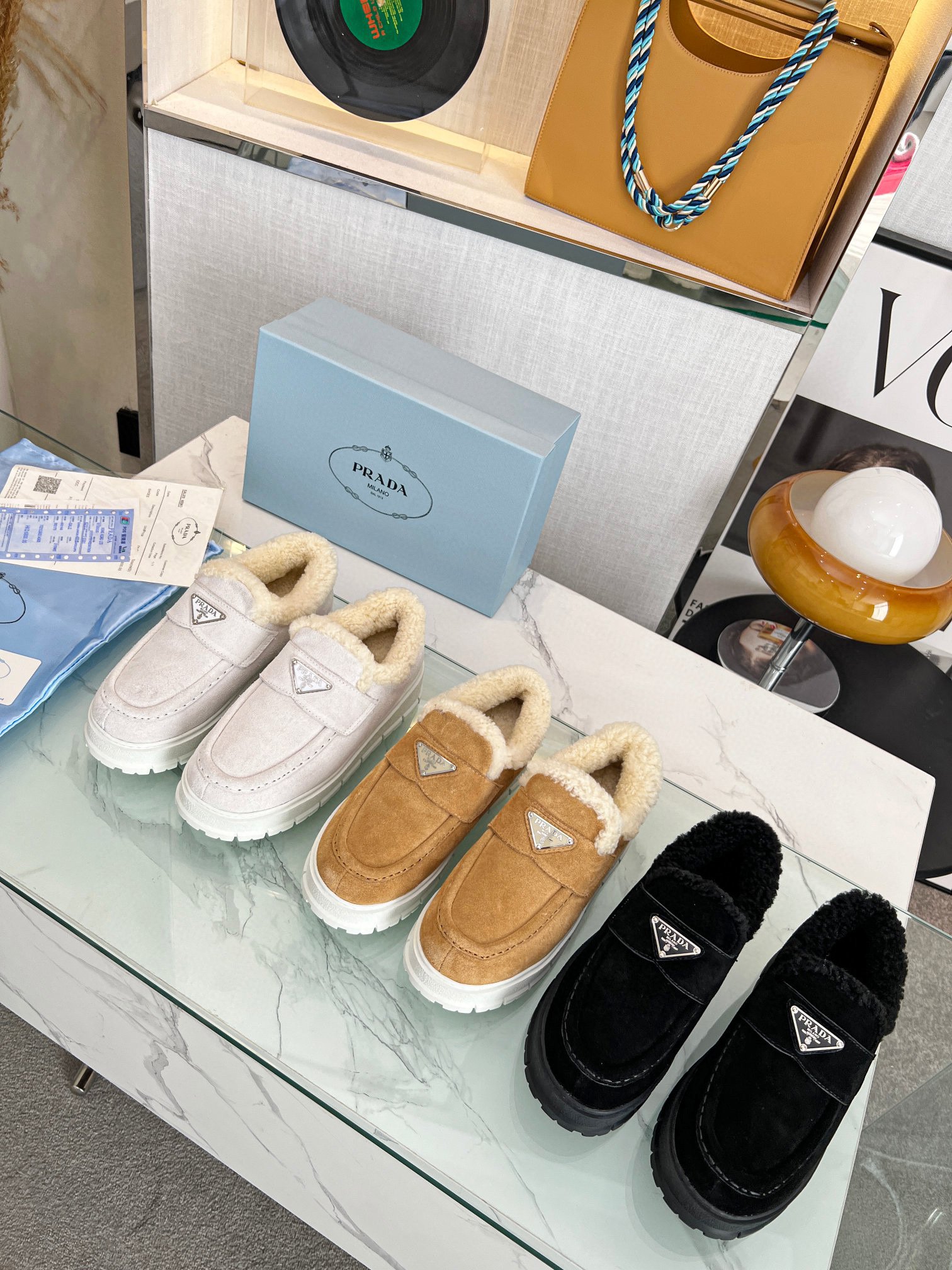 1: 1 Replica Shoes Black Upper with leather band and enameled metal triangle logo Apron with stitched raised edge Shearling lining Removable shearling-covered insole