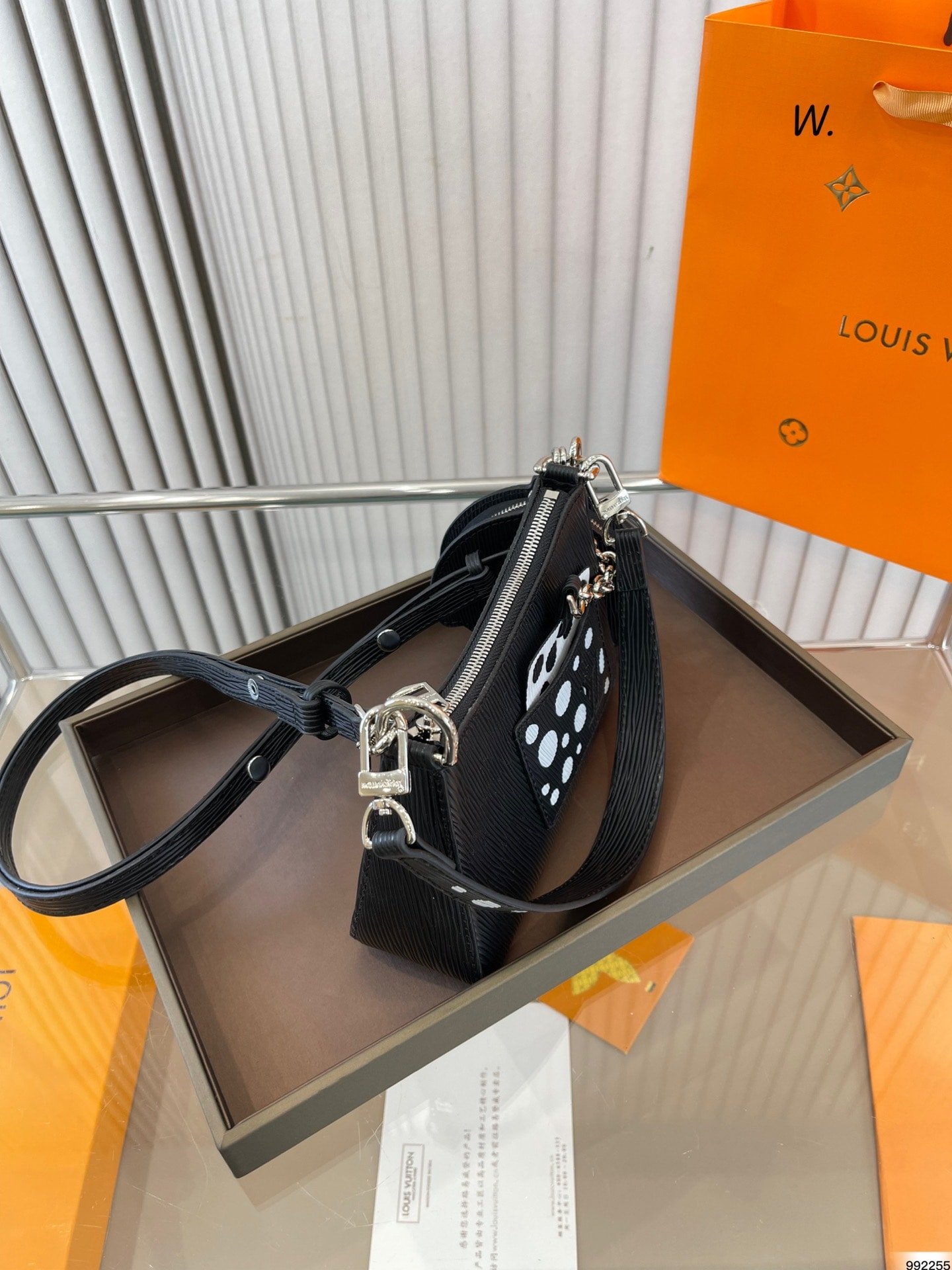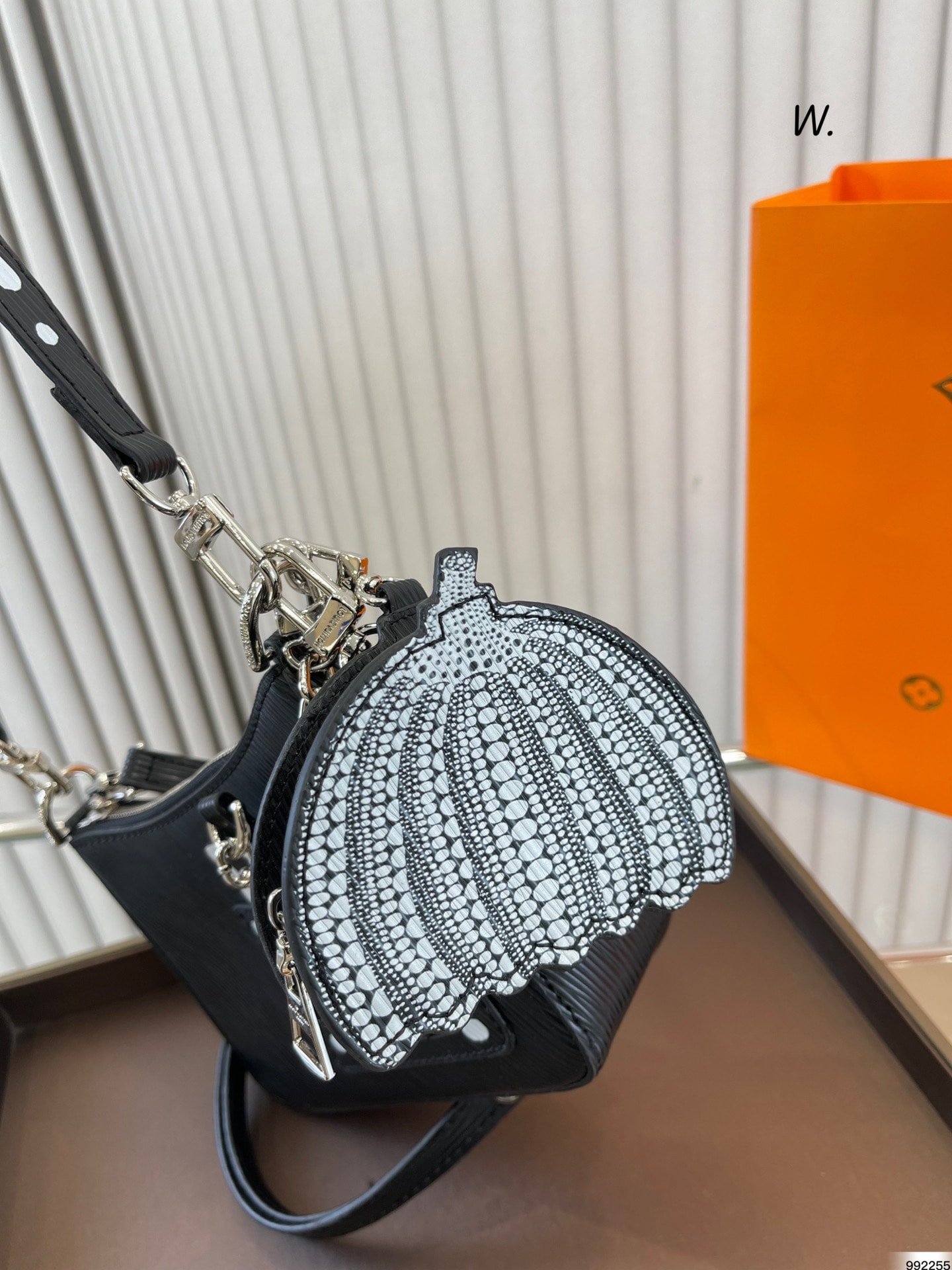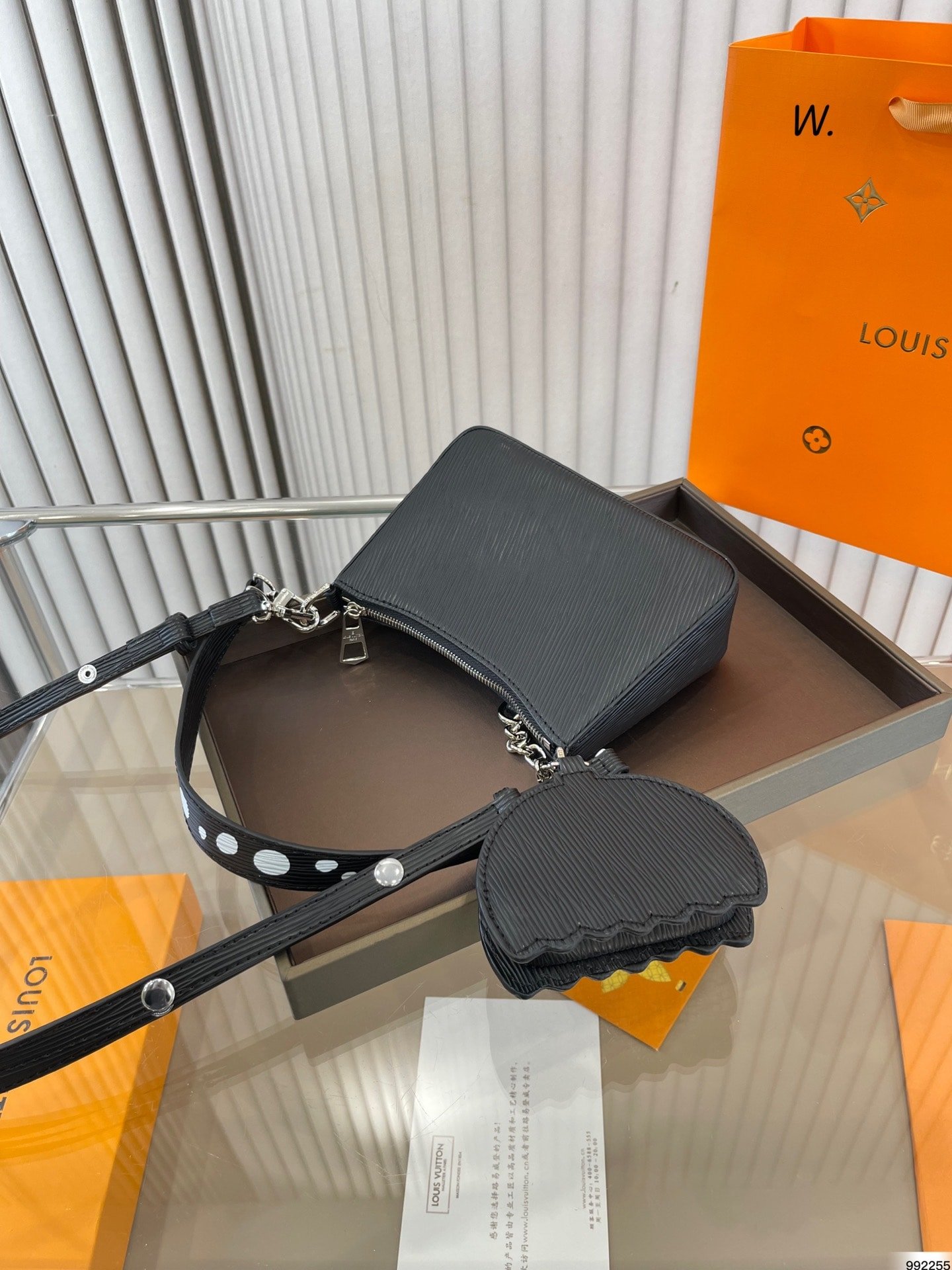 1:1 Replica Bags 20 x 12 / 7.8 x 4.7 inches (Length x height? ) Black / White Grained Epi cowhide leather Microfiber lining Silver-color hardware Inside LVxYK signature Zipped closure Front flat pocket with Infinity Dots print Zipped removable mirror hooked to the bag on a removable chain Inside flat pocket Removable pumpkin-shaped coin […]