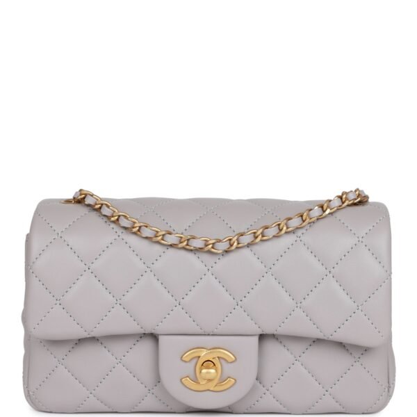 This Mini flap bag is of light grey with tone hardware and has a front flap with signature turnlock closure. rear half moon pocket. single interwoven light grey leather and tone link shoulder/crossbody strap with adjustable “pearl” ball.