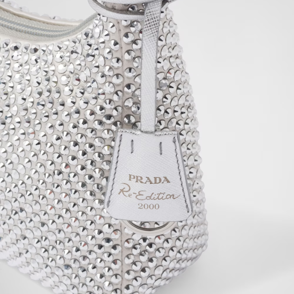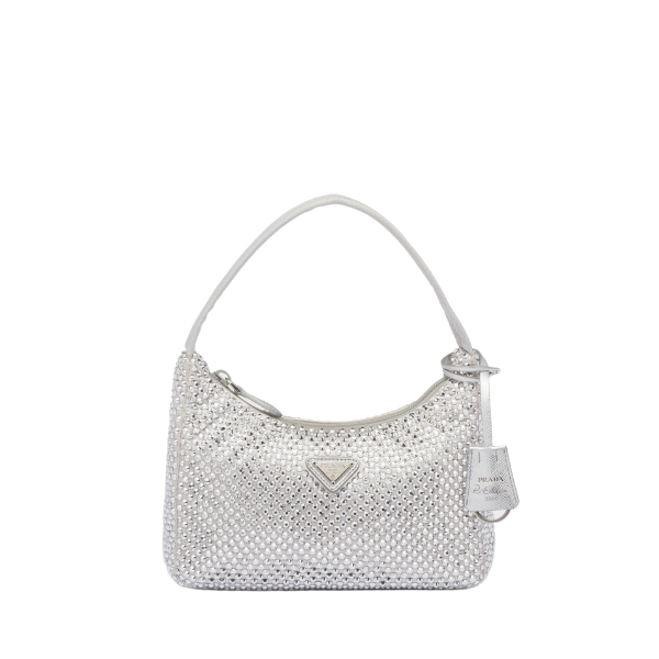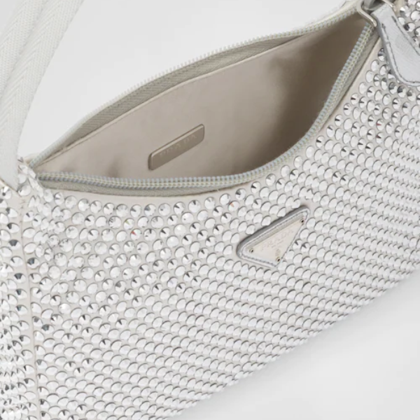 1:1 Replica Bags Measurements: 21 x 5 x 16 cm / 8.3 x 2 x 6.3 inches All-over decoration Zipper closure Enameled metal triangle logo Silk satin lining