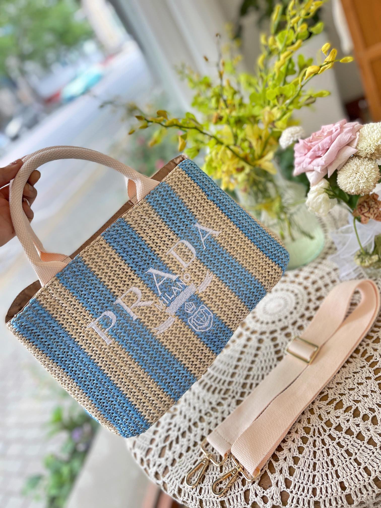 1:1 REPLICA BAGS Measurements: 30 x 19 x 8 cm / 11.8 x 7.5 x 3.1 inches Raffia handles Embroidered lettering logo on the front Enameled metal triangle logo on the side Unlined