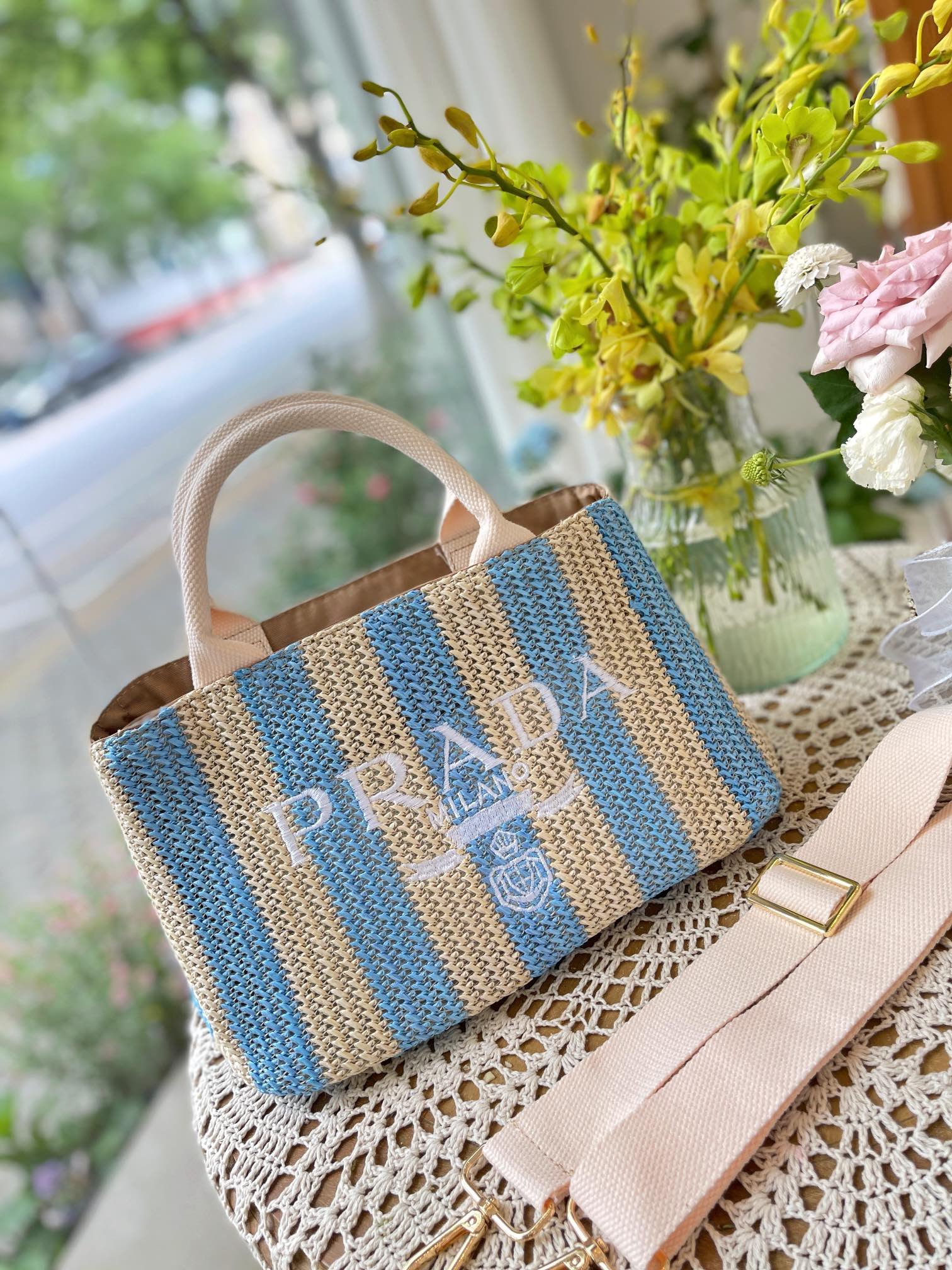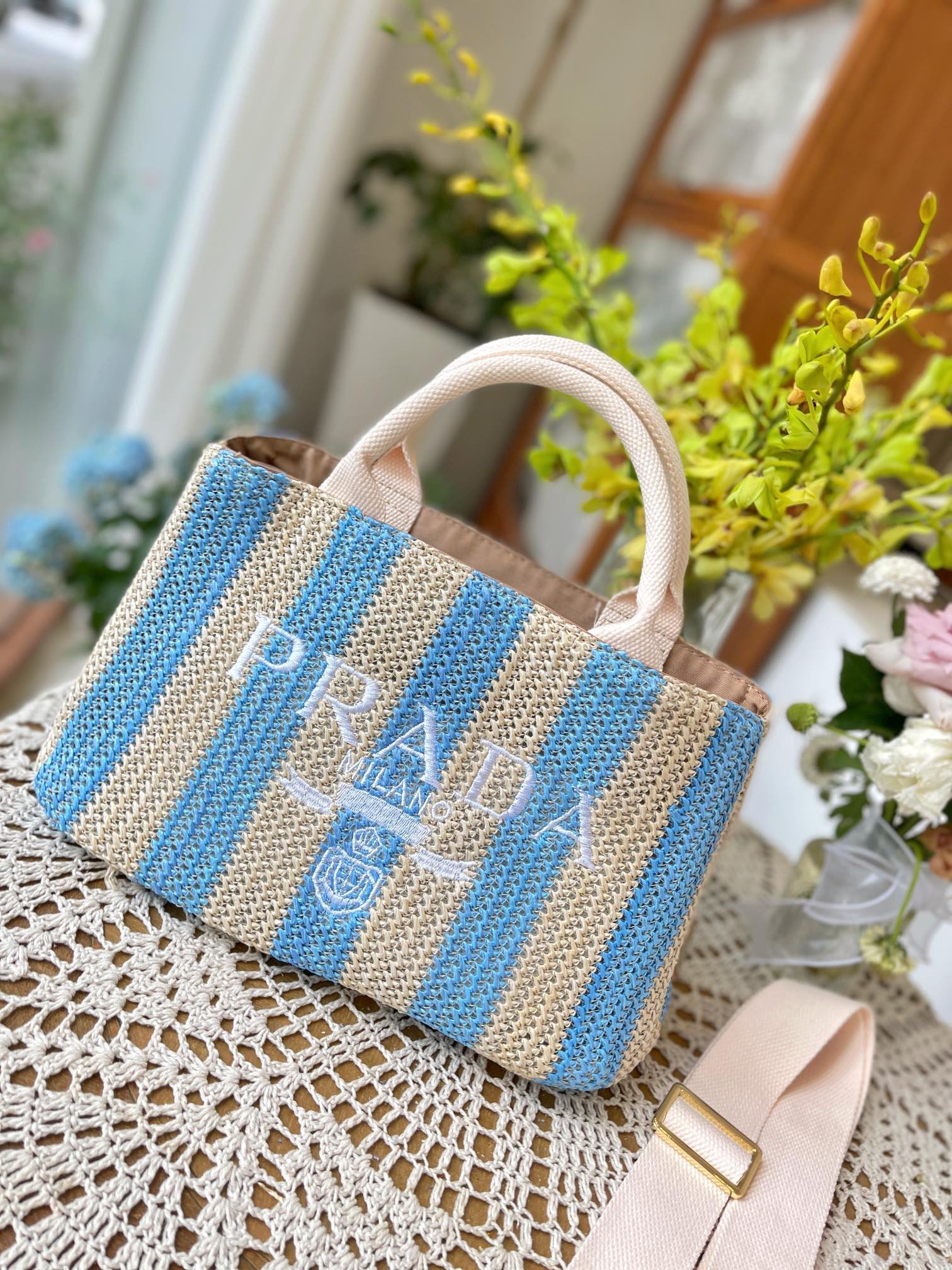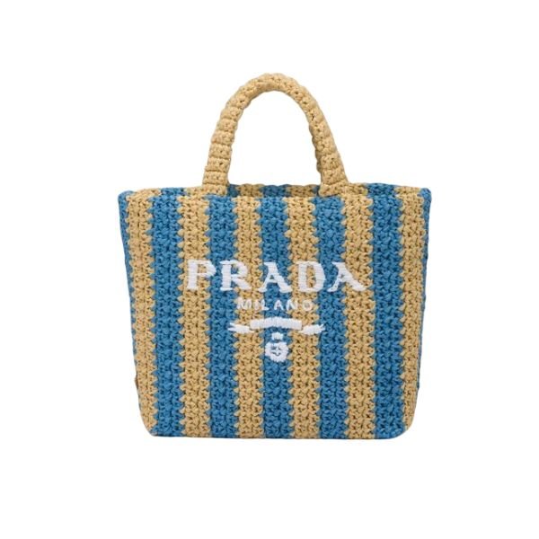 Prada Raffia Tote Bag Tan And Blue 1Bg4222A2Tf0O8Avoor