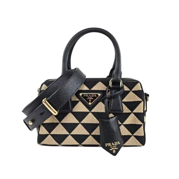 - Here, the brand’s iconic geometric design is transformed into a sophisticated yet modernist pattern that plays with contrasting colors and decorates this versatile bag.