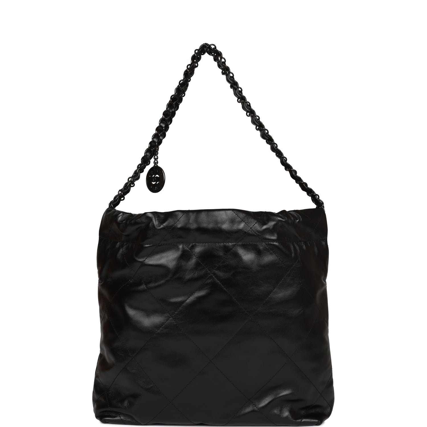 This Small 22 Tote bag is of SO black with?black hardware and has the signature diamond quilting. Luxury on the front in?black metal. removable pouch. and long black and black leather chain.