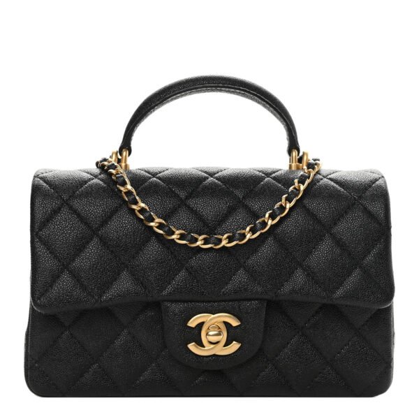 This is an authentic Mini Top Handle Rectangular Flap in Black. This chic mini crossbody is crafted of iridescent leather in black. The bag features a leather top handle. an aged gold chain link leather threaded shoulder strap and a facing aged gold turn lock. This opens the flap to a black leather interior with zipper and patch pockets.