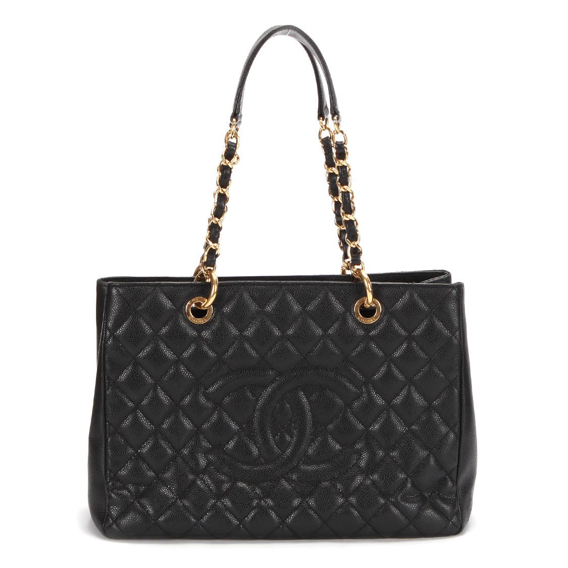 This is an authentic Grand Shopping Tote GST in Black. This stylish tote is crafted of diamond leather in black. The bag features leather threaded polished chain-link shoulder straps with leather shoulder pads. a prominent logo on the front. and a rear flat pocket. The top opens to a partitioned black satin interior with a central zipped compartment. zipper and patch pockets.